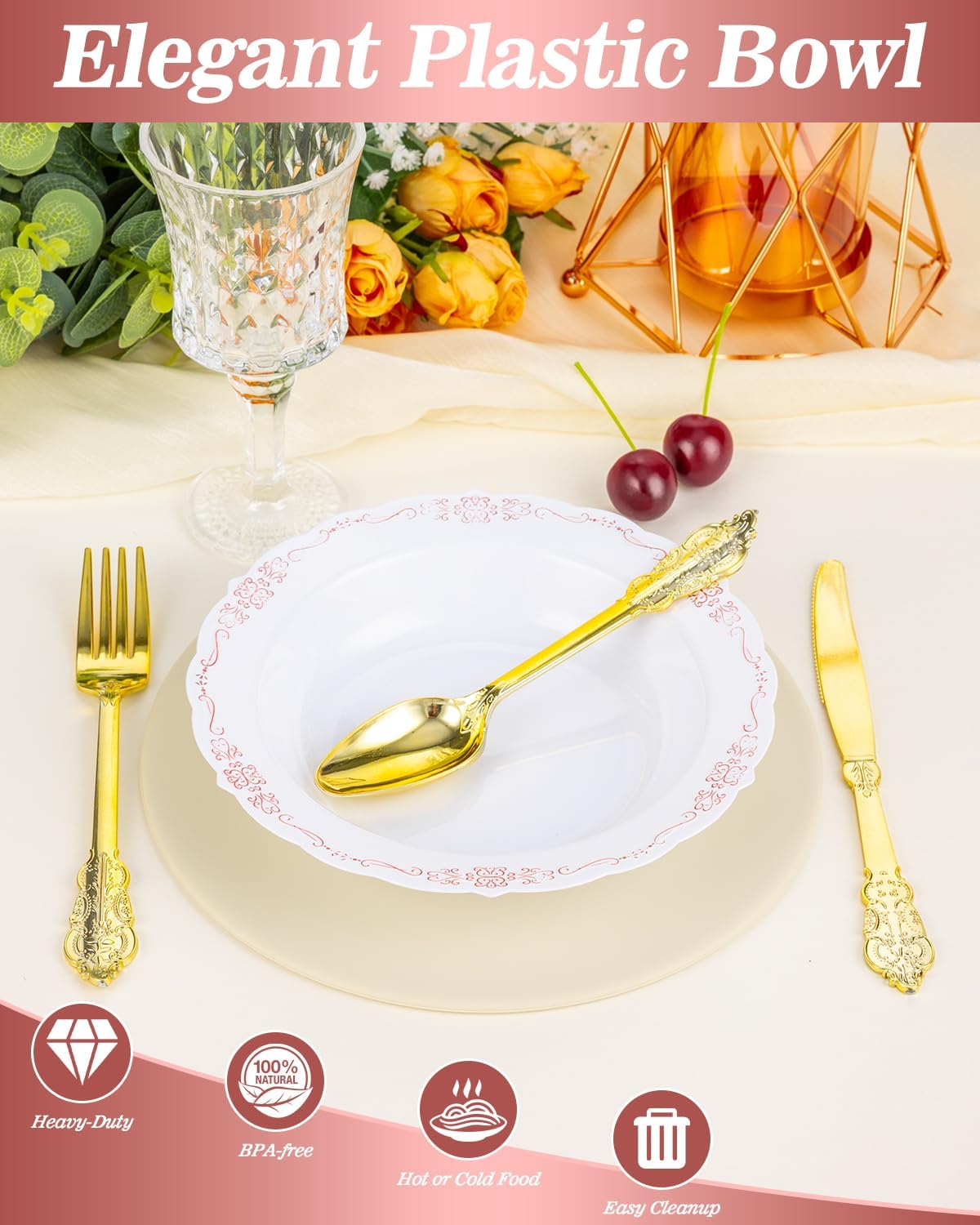 - Elegant Design: BESTLUCK disposable bowls feature vintage rose gold pattern engravings on the rim, complementing various colored dinnerware. They add an elegant touch to any occasion, from casual gatherings to formal wedding banquets. Each plastic bowl is designed with a wide rim for comfortable handling and effective spill prevention
