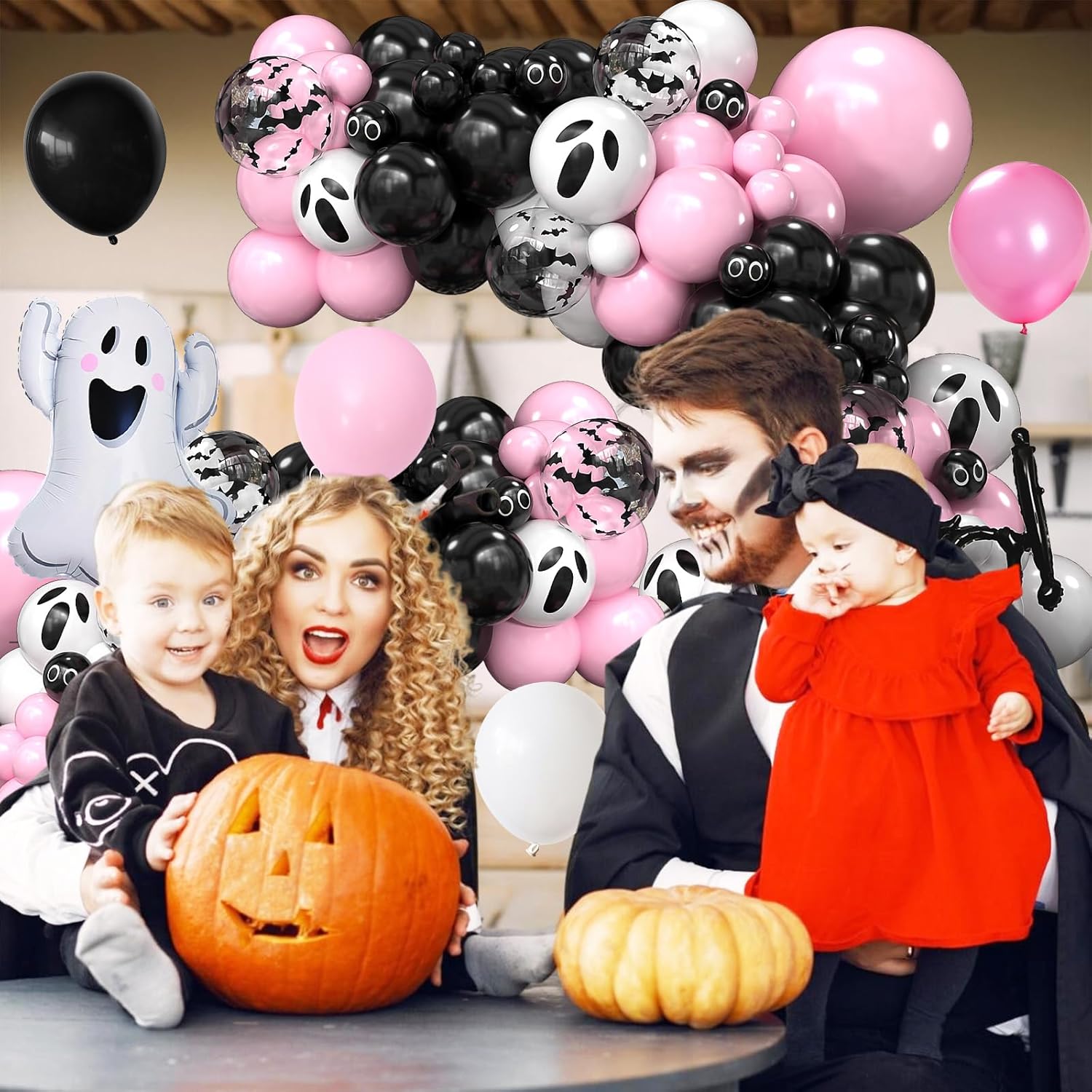 Halloween Balloon Arch Kit, Black Pink Balloons Garland Arch Kit with Large Ghost and BOO Foil Balloon, Eyes Bat Ghost Printed White Balloons For Halloween Decorations Home Garden Party Supplies