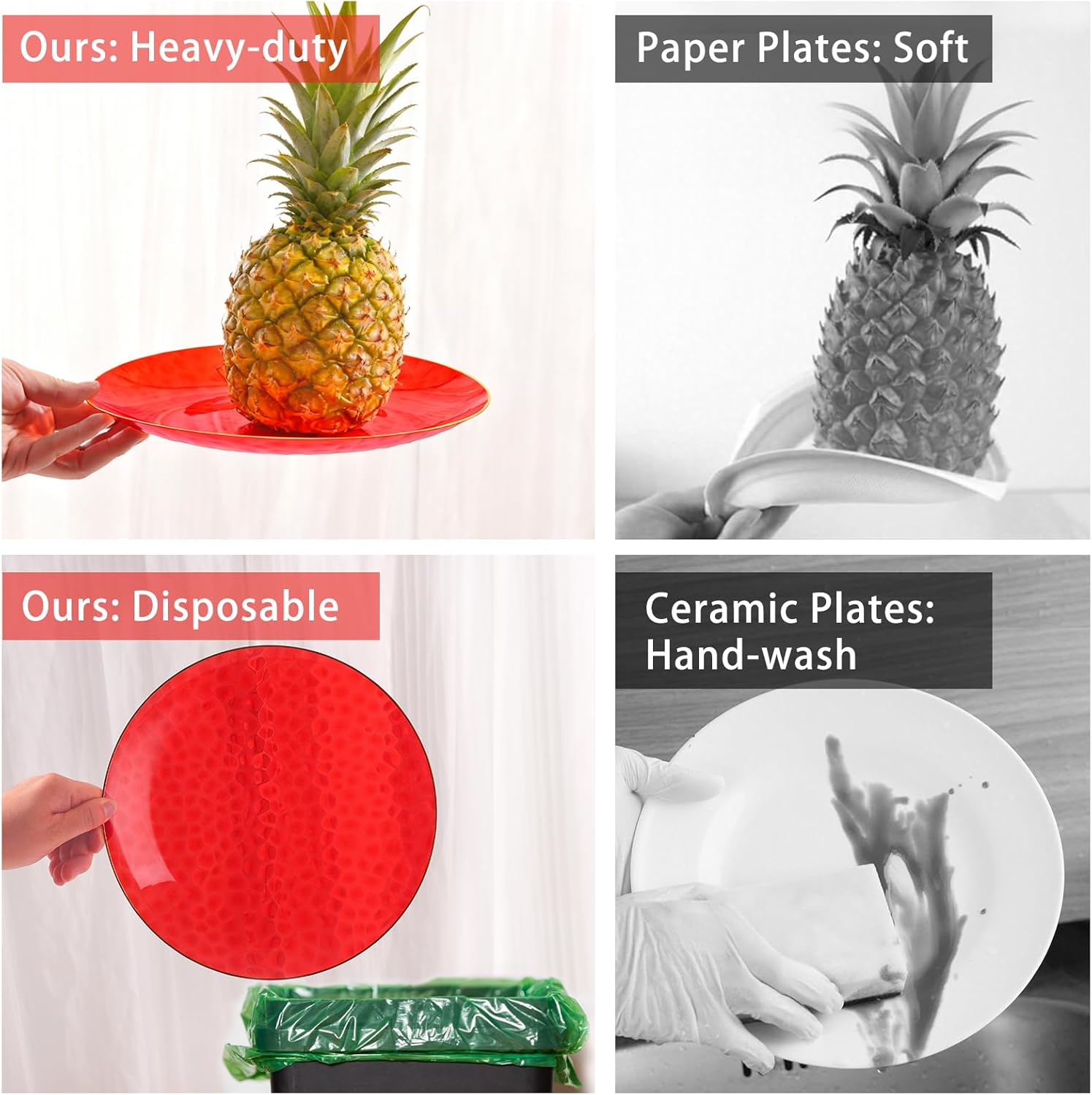 - Perfect for Any Occasion: You can use red and gold plastic plates for any occasion, such as anniversary, birthday, party, Christmas, New Year or others. The combination of functional design and durability ensures red elegant plastic plates handle every meal with ease while complementing your themed decor beautifully.