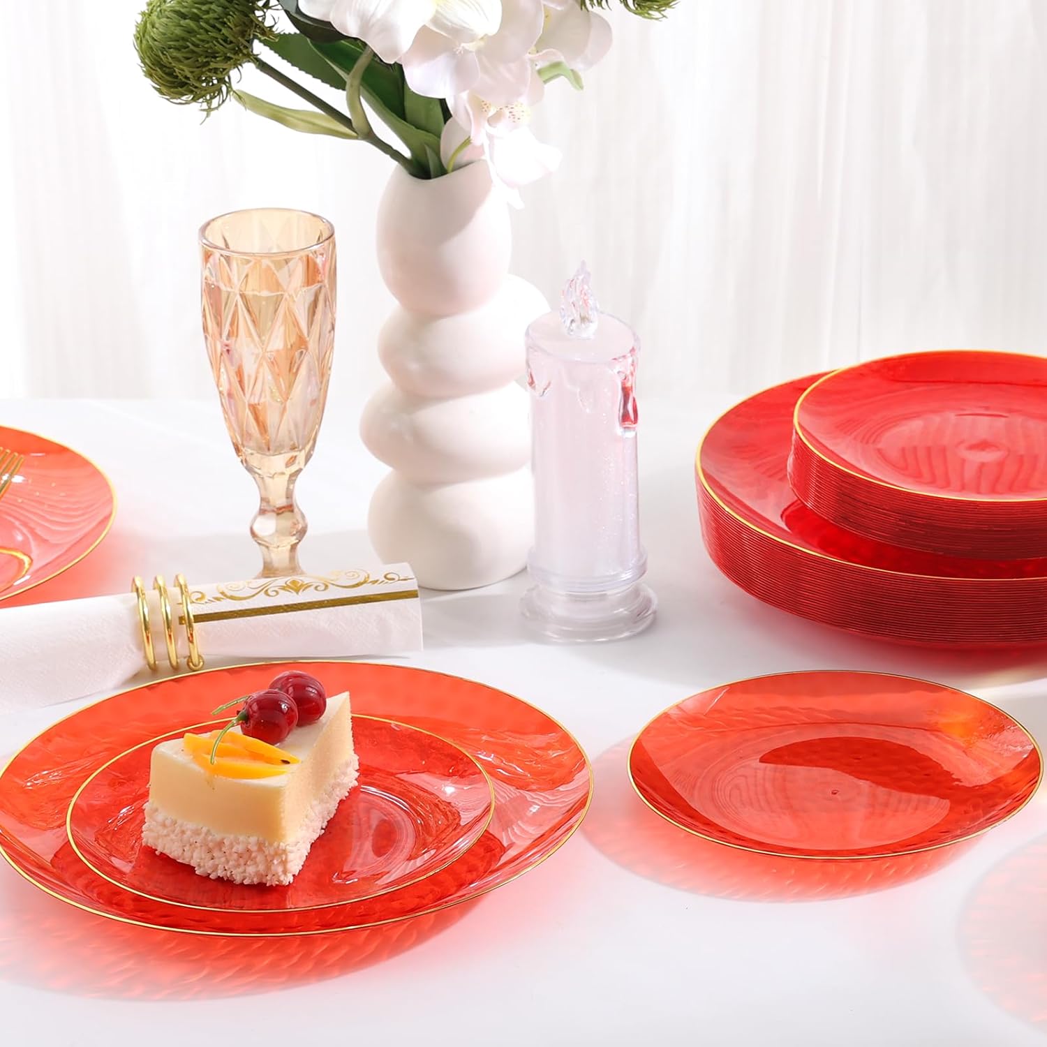 - Quick Cleanup Solution: Enjoy stress-free hosting with our hammered plastic plates! After the gathering, simply rinse the red plastic plates, or treat them as disposable plates and throw them away. Fancy plastic plates allowing you to spend more time enjoying the celebration and less time cleaning up.
