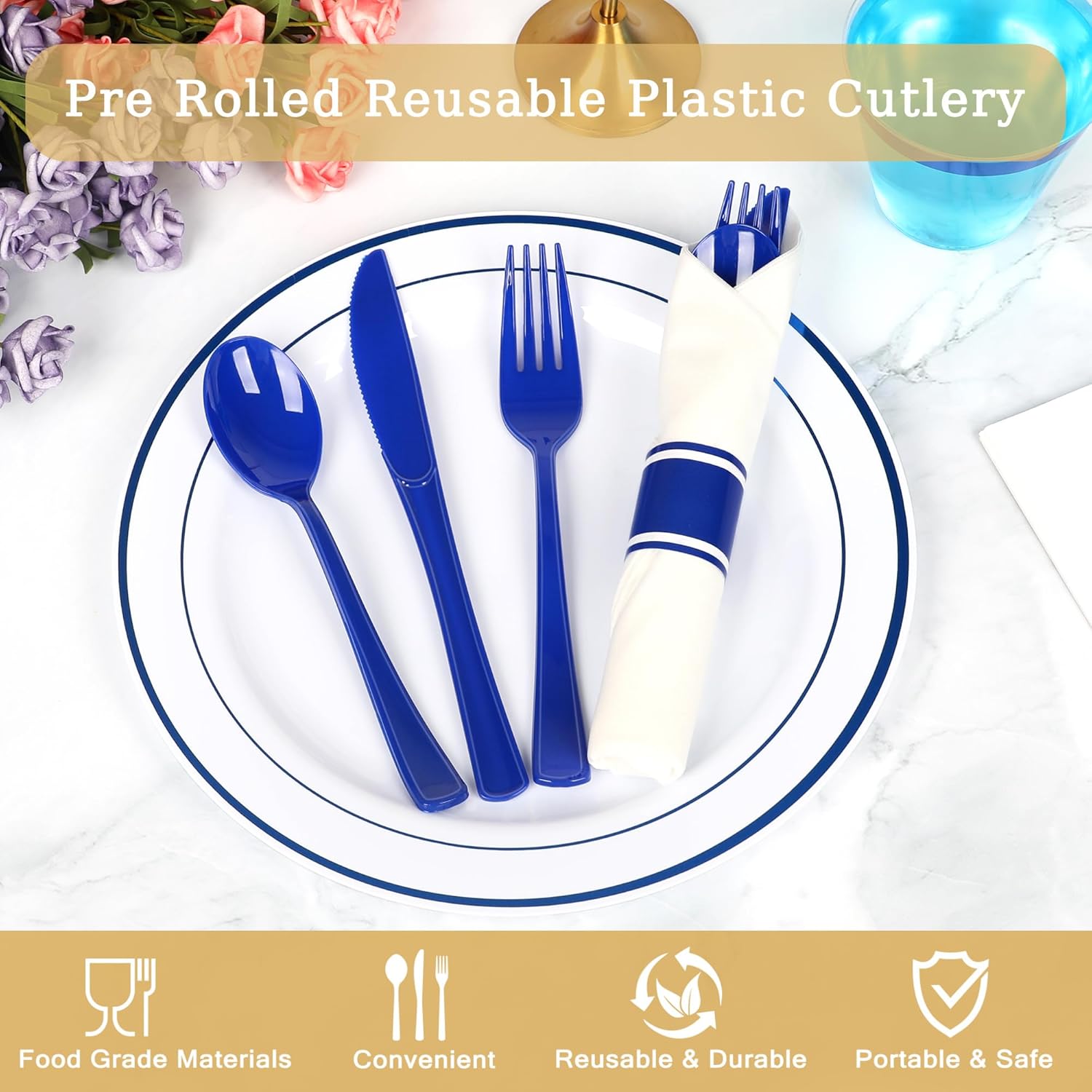 - 【 PRE-ROLLED CONVENIENCE】As the perfect plastic utensils set, you don't even have to worry about buying party napkins. Our disposable silverware,paired with these pre-rolled napkins, makes your events easier.Prepare breakfast, lunch, dinner or a buffet meal service for 50 honored guests with pre rolled napkins with plastic cutlery set(blue plastic forks,plastic spoons,plastic knives). Great value when you are in need of a napkin set with a fork, knife, and a spoon for all kinds of events