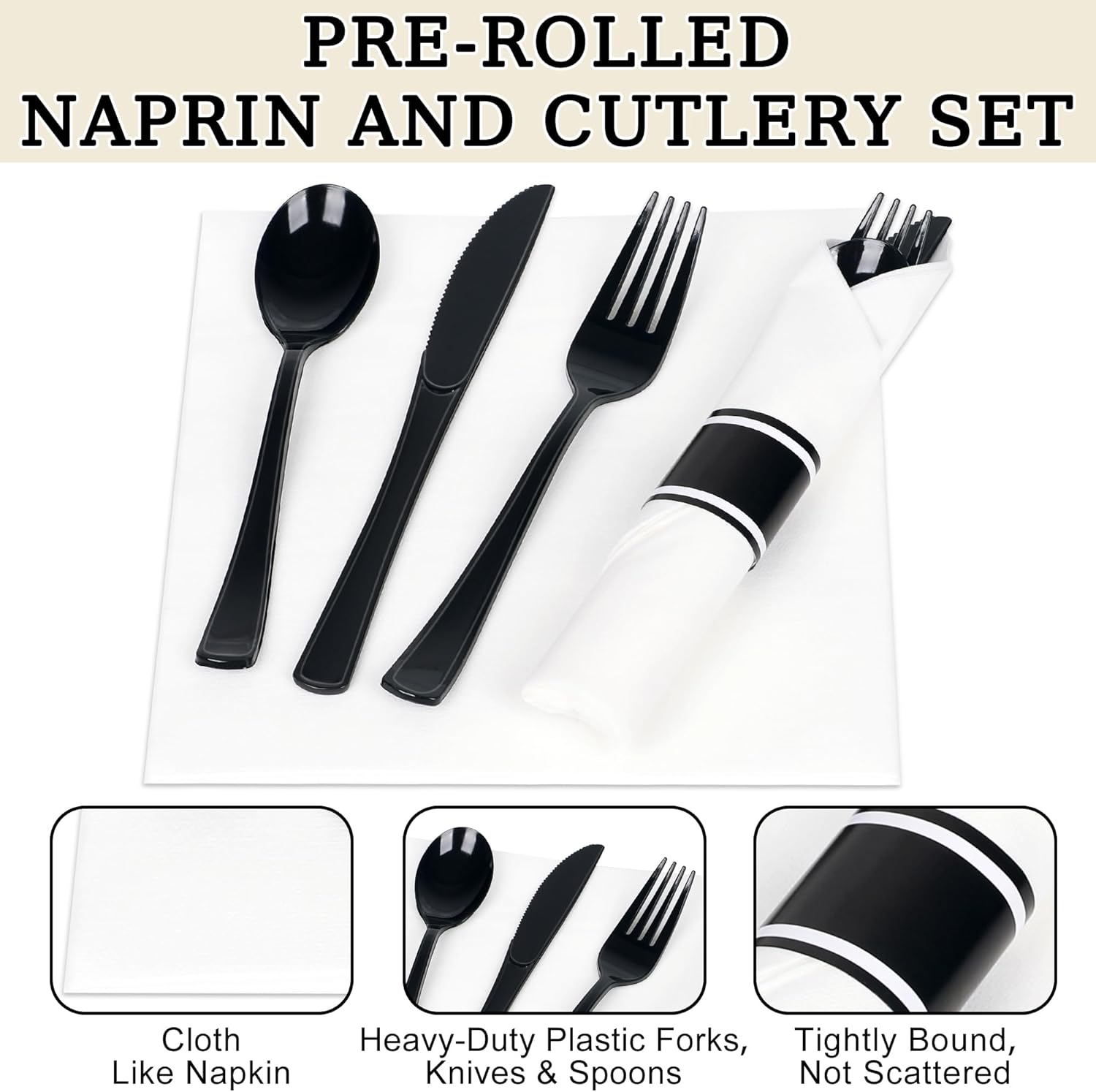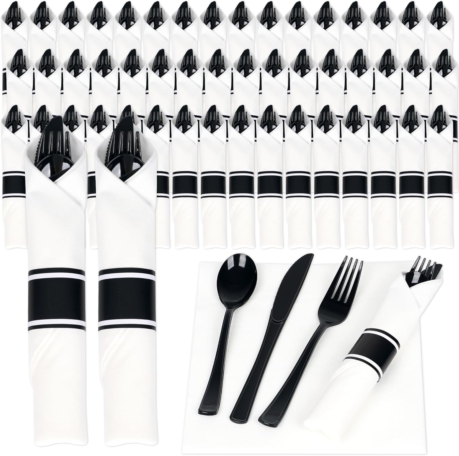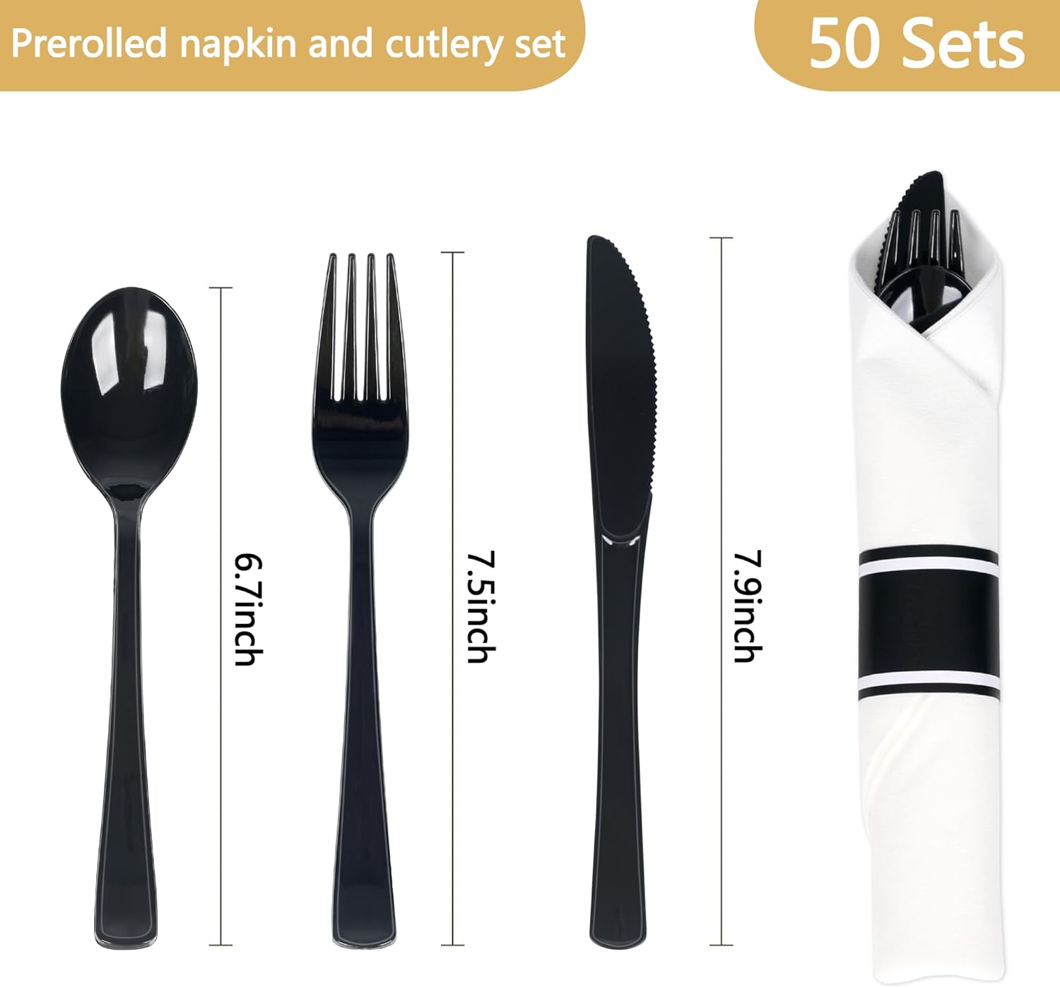 - 【 PRE-ROLLED CONVENIENCE】As the perfect plastic utensils set, you don't even have to worry about buying party napkins. Our disposable silverware,paired with these pre-rolled napkins, makes your events easier.Prepare breakfast, lunch, dinner or a buffet meal service for 50 honored guests with pre rolled napkins with plastic cutlery set(black plastic forks,plastic spoons,plastic knives). Great value when you are in need of a napkin set with a fork, knife, and a spoon for all kinds of events