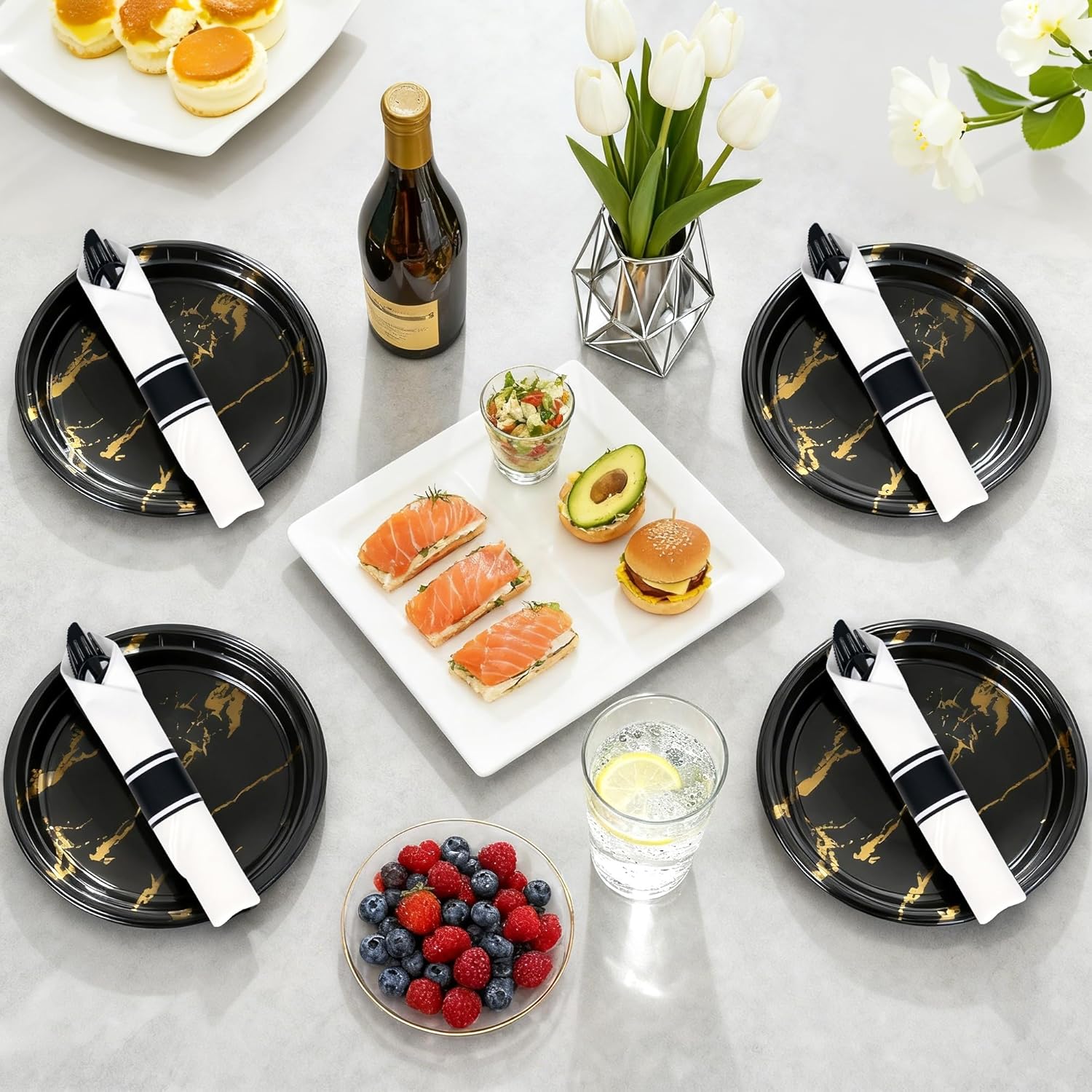 - 【 ELEGANT DESIGN&ERGONOMIC 】 With decent appearance, you can use the prewrapped |disposable utensils|black plastic cutlery to decorate the dinner table and prepare the feast !This utensils plastic disposable with shiny gold color and highly reflective finish looks like real metal cutlery and perfect for the table arrangement add an elegant atmosphere to the party.This disposable flatware set is designed with an ergonomic handle that can provide a better grip for you while eating or cutting