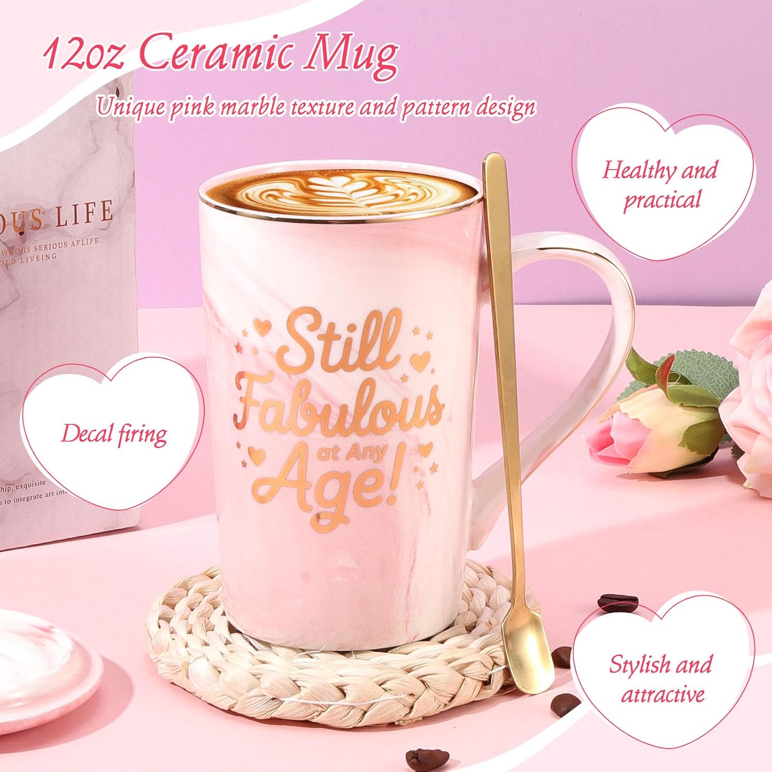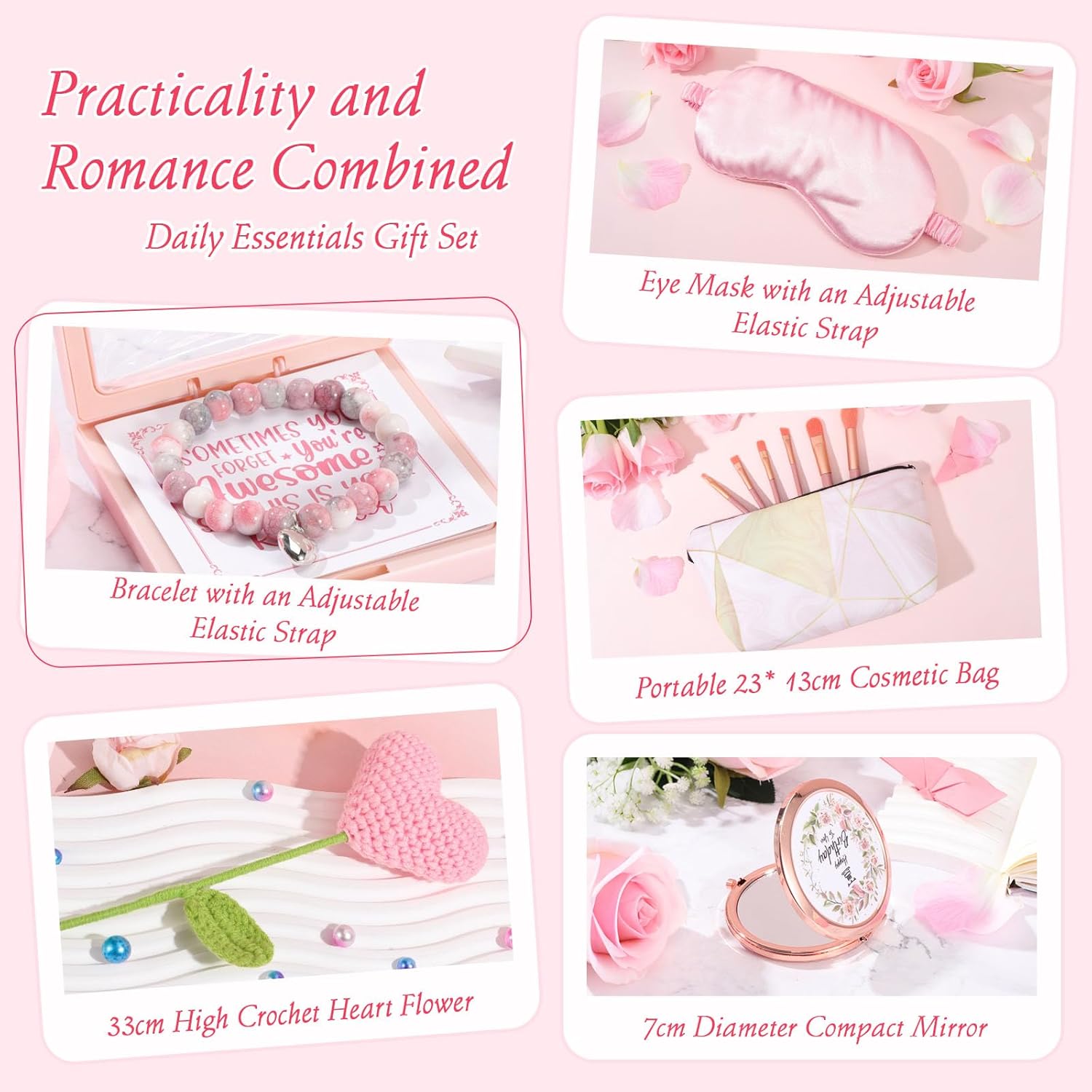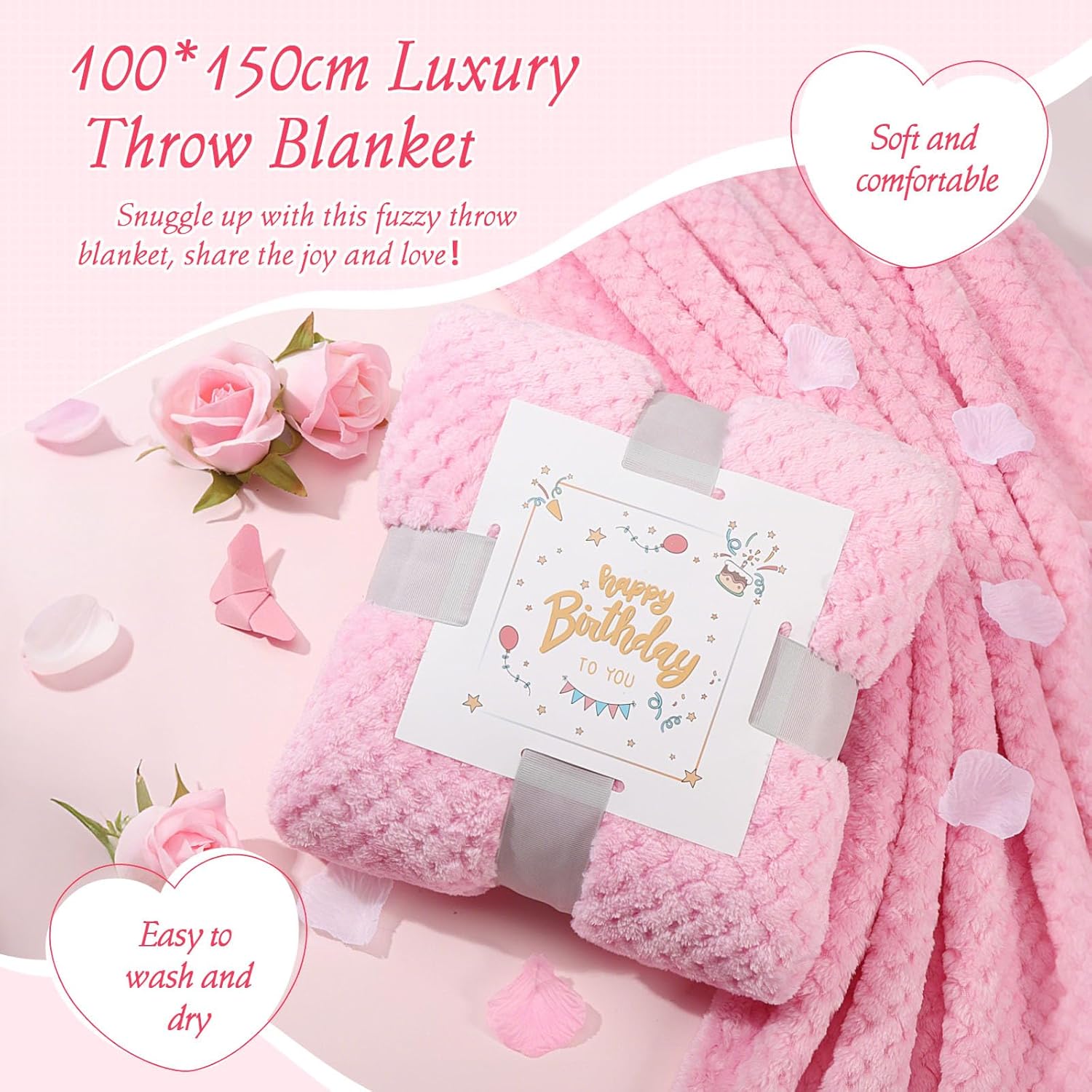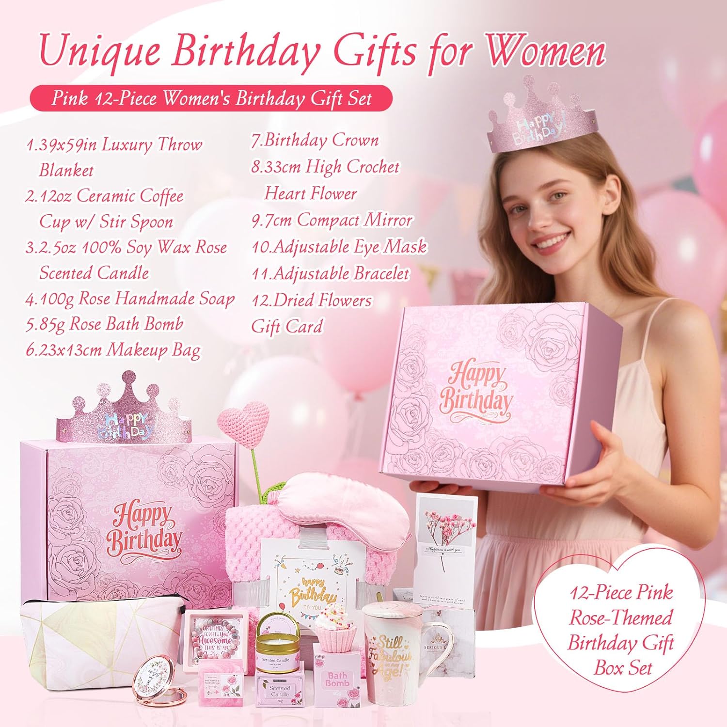 - 12-PIECE ALL-IN-ONE PINK GIFTS FOR WOMEN BIRTHDAY: Surprise her with 12 well curated thoughtful pieces - 39x59in luxury throw blanket, 12oz ceramic coffee cup w/ stir spoon, 2.5oz 100% soy wax rose scented candle, 100g rose handmade soap, 85g rose bath bomb, 23x13cm makeup bag, birthday crown, 33cm high crochet heart flower, 7cm compact mirror, adjustable eye mask, adjustable bracelet, and dried flowers gift card wrapped in a rose-themed gift box