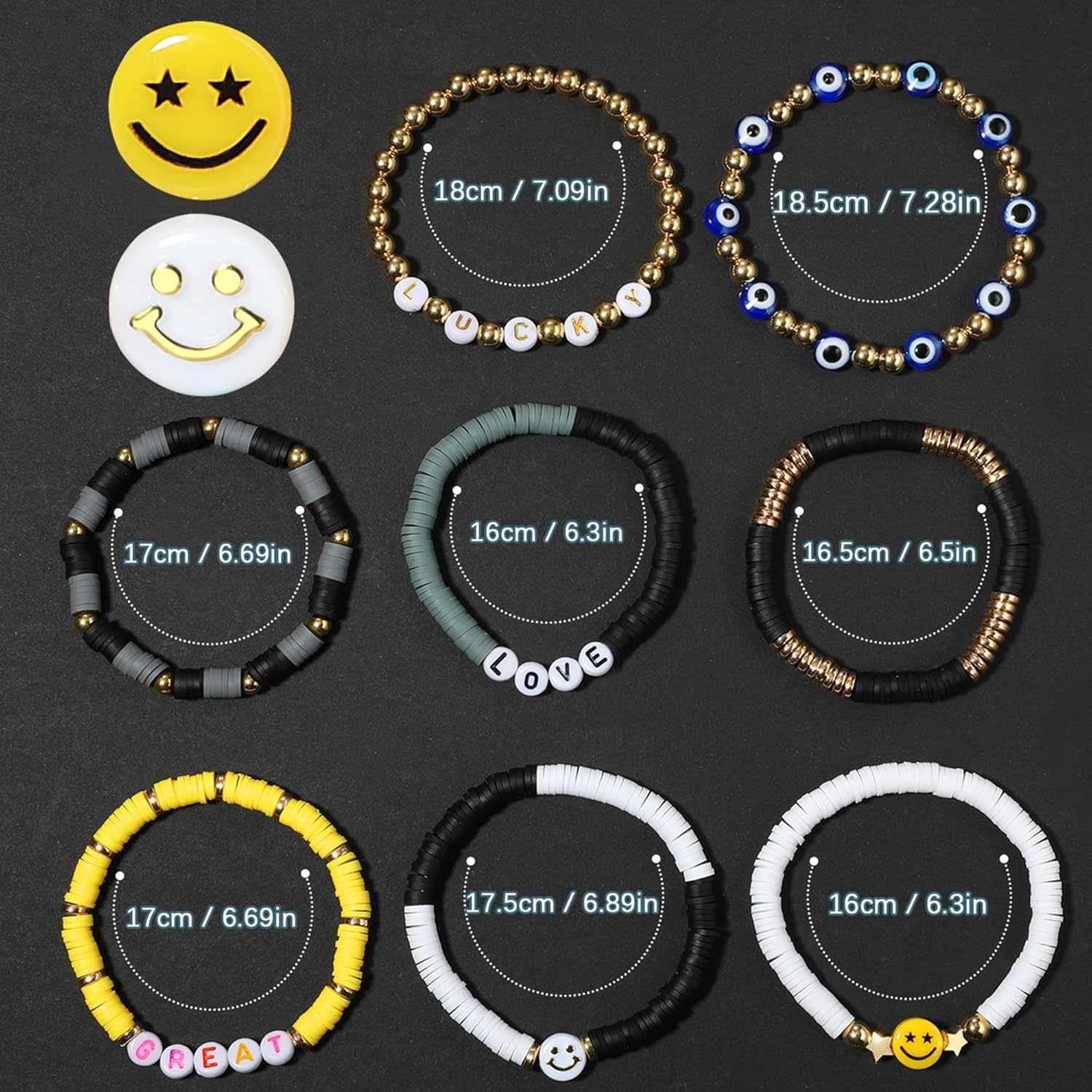 - Preppy Bracelets Design: This bracelets set comes with 8 pieces colorful bracelets in different style. It is collected and designed by kinds of special elements - smile, star, heart, golden beads, white vinyl clay, artificial pearl, and so on. Each of them exudes a unique charm.