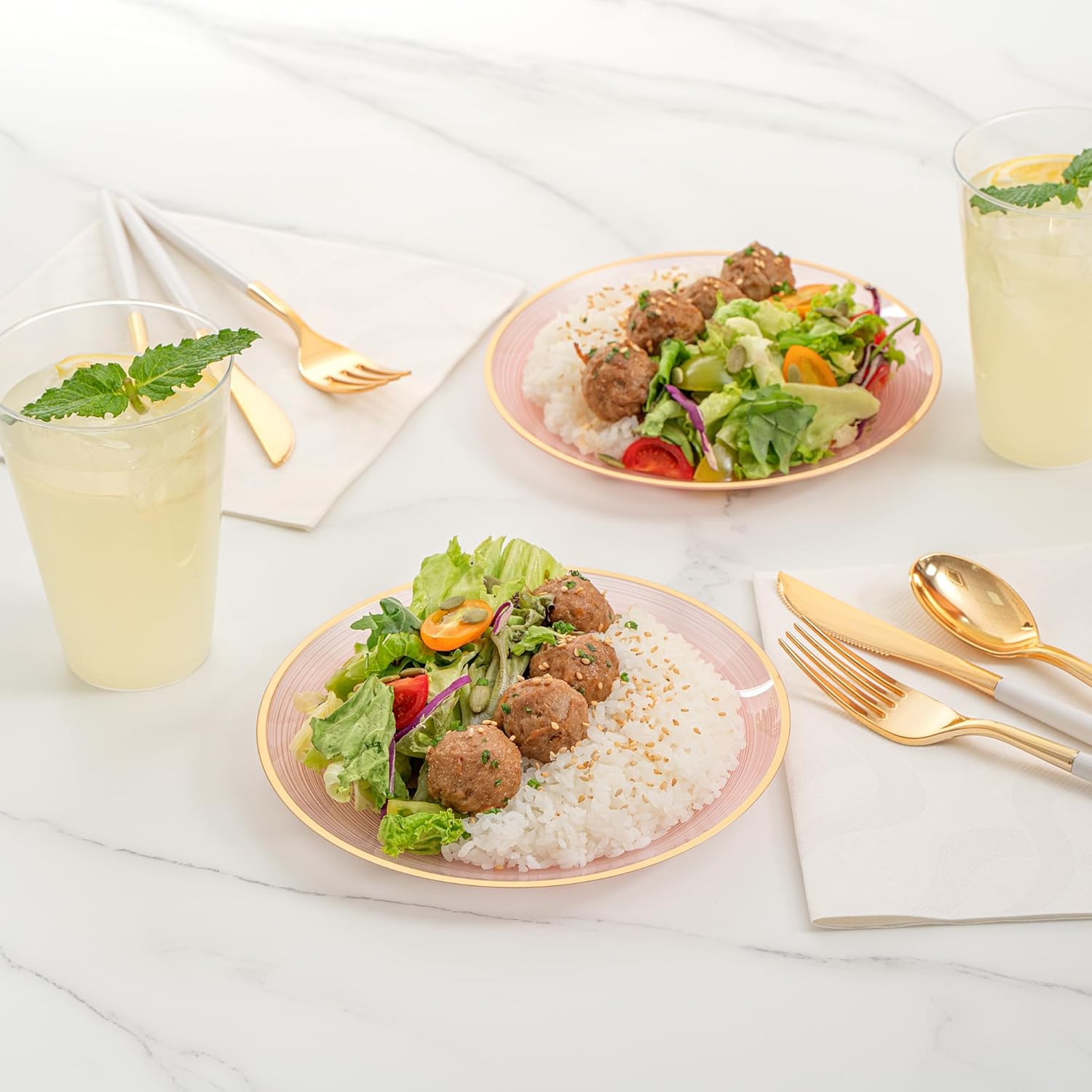 Restaurantware Plastic Plates 100 Pcs 7.25" Gold Rimmed Disposable Plates Heavy-Duty Pink Translucent Rippled Plastic Dinner Servers for Party, Weddings, Salads, Desserts, and Appetizers