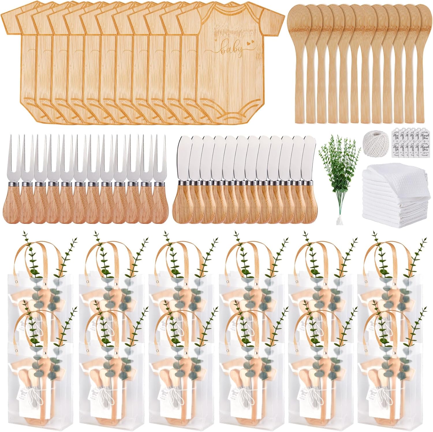 - Complete Party Gift Set: This thoughtful 109-piece baby shower prizes for game winners includes 12 bodysuit shaped cheese boards, 12 spoons, 12 forks, 12 butter spreaders, 12 kitchen towels, 24 artificial eucalyptus stems, 12 charming gift tags, 12 clear gift bags, and a roll of string. Carefully curated to offer both elegance and practicality, these items elevate any event with convenience and charm