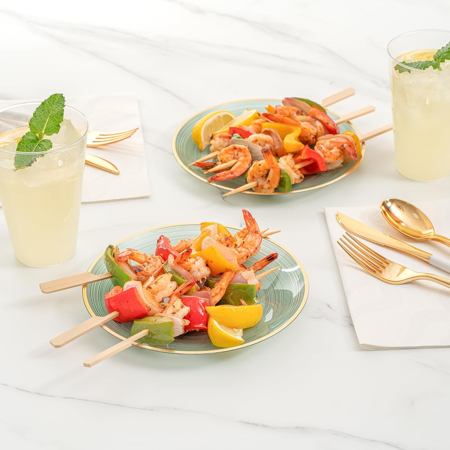 - ELEGANT PRESENTATIONS: Elevate your events with gold rimmed plates that bring sophistication to any table setting, whether it's a wedding reception, corporate event, or dinner party.