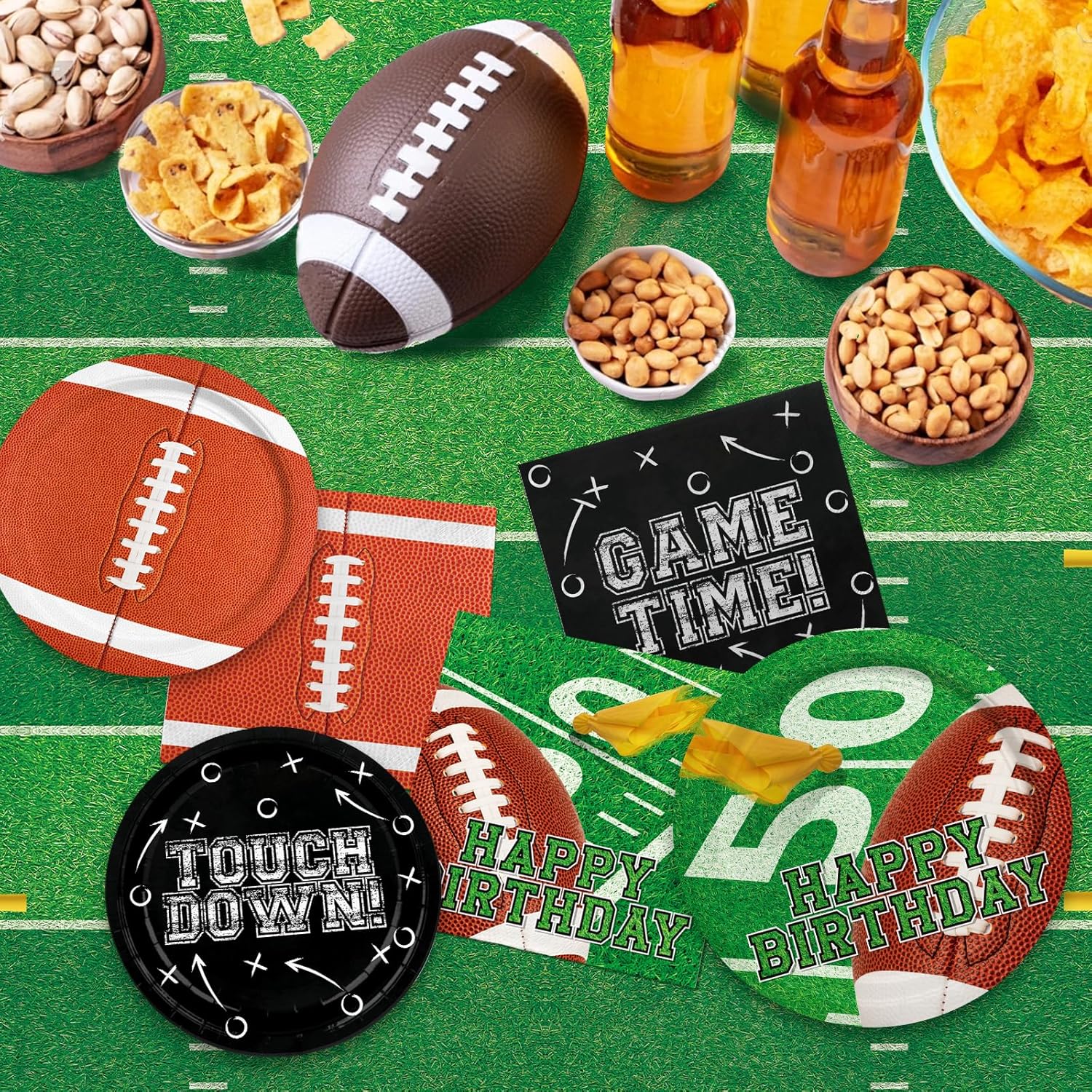 - Celebrate Game Day in Style: Elevate your tailgate or football-themed birthday bash with our comprehensive football party supplies kit. Including 24 x 9-inch football paper plates, 24 x 7-inch dessert plates (in two designs), 24 x 12 oz cups (in two designs), 24 mix-designed paper napkins, and 2 vibrant touchdown tablecloths (54 x 108 inch each, in two designs). Immerse your guests in an authentic football experience while keeping cleanup hassle-free with our disposable supplies.