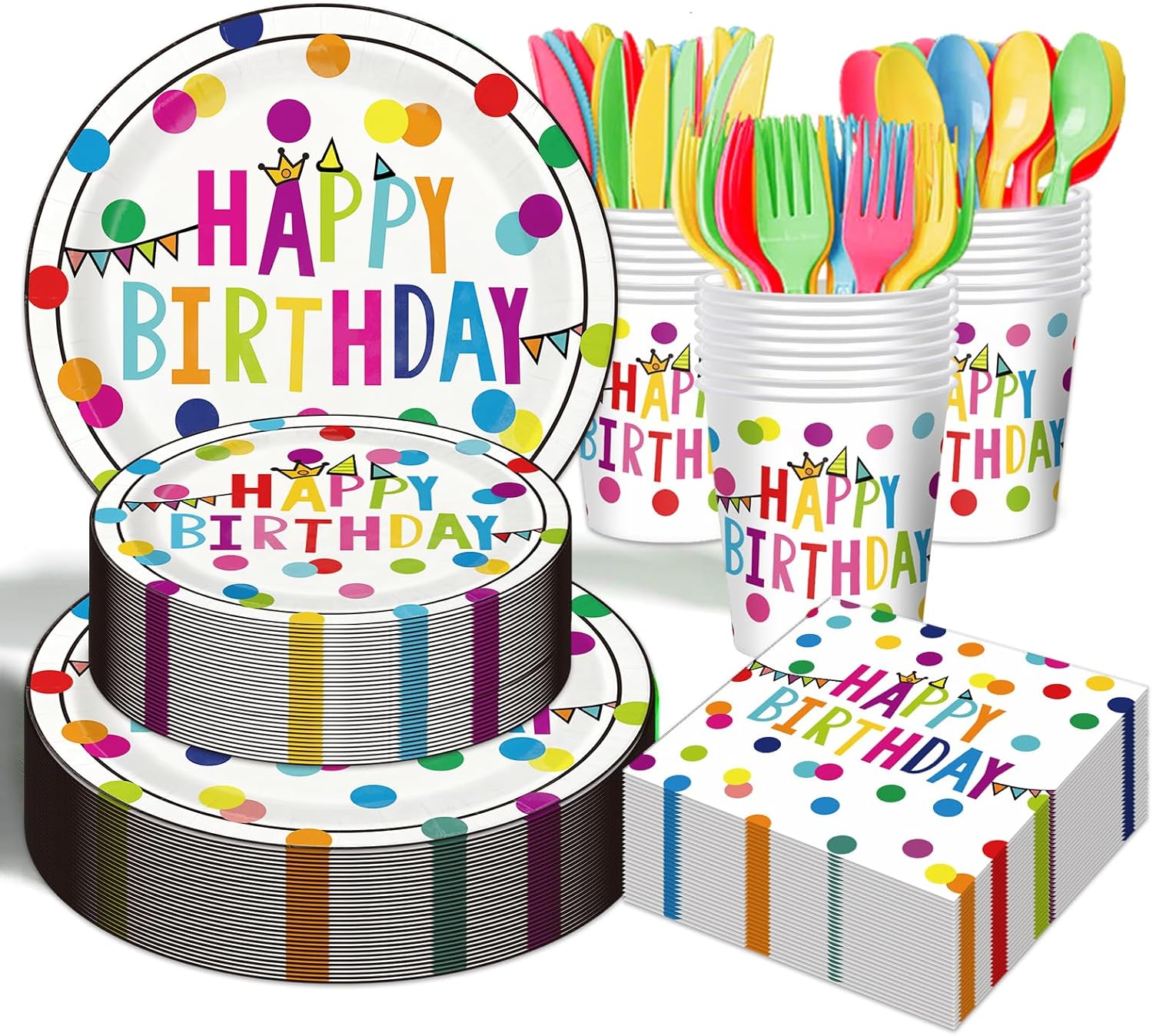 - High Quality Reliable Material Design: Our happy birthday plates and napkins set all paper plates, cups and napkins are made of 350 grams of hard cardstock, 100% non-toxic, which sturdy and won't fold or teared easily, perfect for cake, sandwiches, salad, fruit, etc. Disposable paper cups can withstand cold and hot drinks without worrying about leakage. Printed with colorful “Happy Birthday” slogan and colorful dots create a vibrant atmosphere for kids birthday party, sharing more funny to everyone.