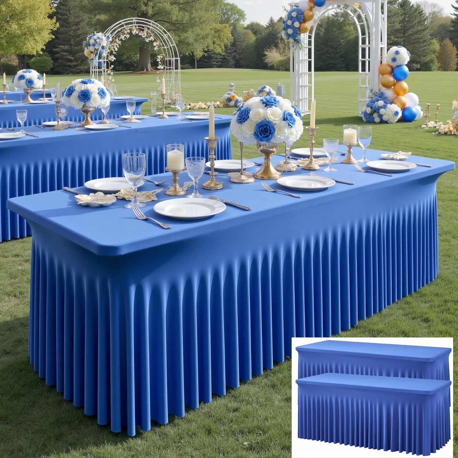 2 pk Royal Blue Spandex Tablecloths 8ft with Ruffle Table Skirt, Wrinkle Free Stretchy Fitted Tablecloth for 8 Foot Rectangle Tables, Elastic Spandex Table Covers 8ft for Party Wedding Banquet