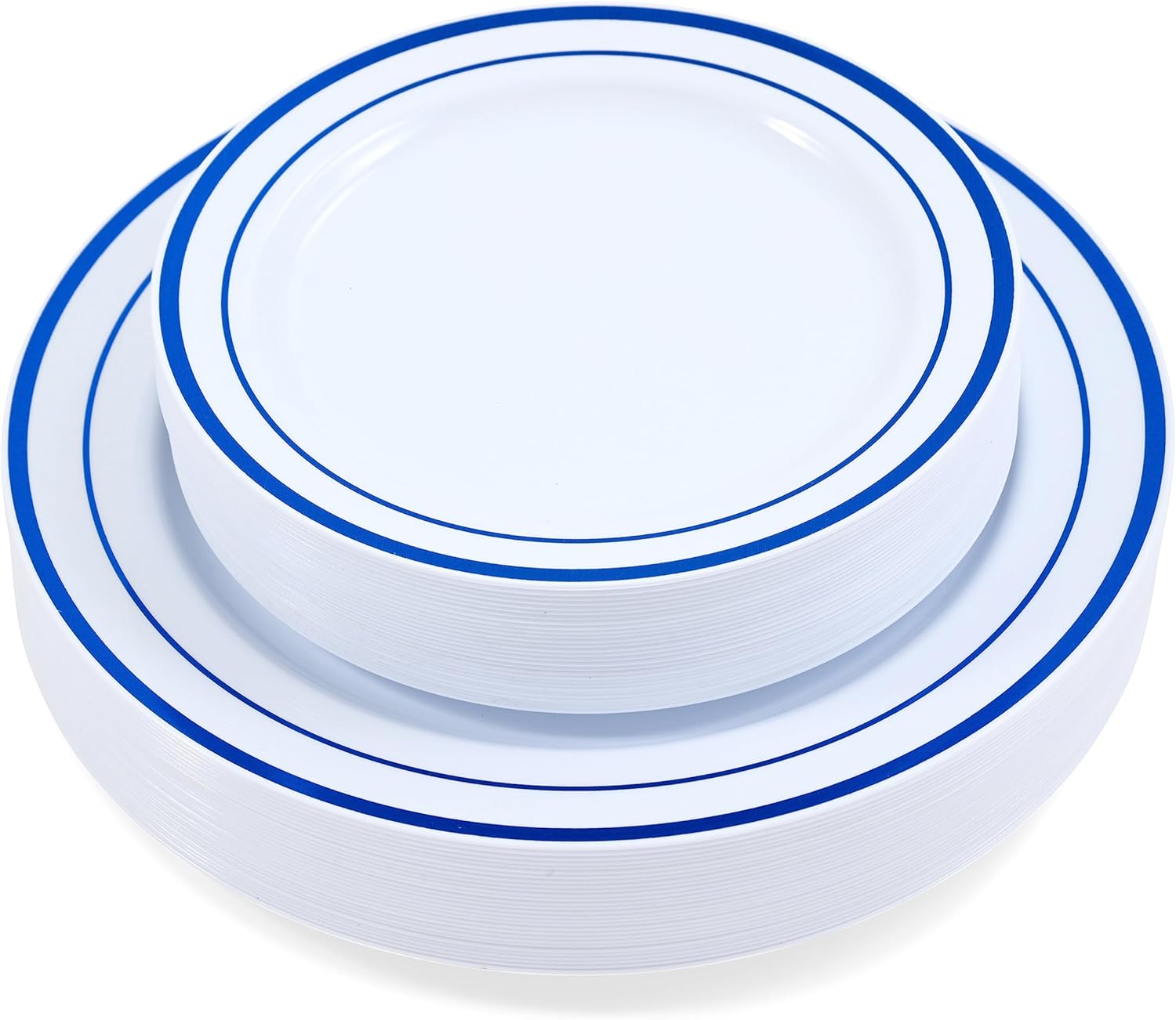 120-Piece Plastic Plates Set Premium 60 Dinner & 60 Salad Plates Pack, Disposable Plates for Party - White Plastic with Blue Rim