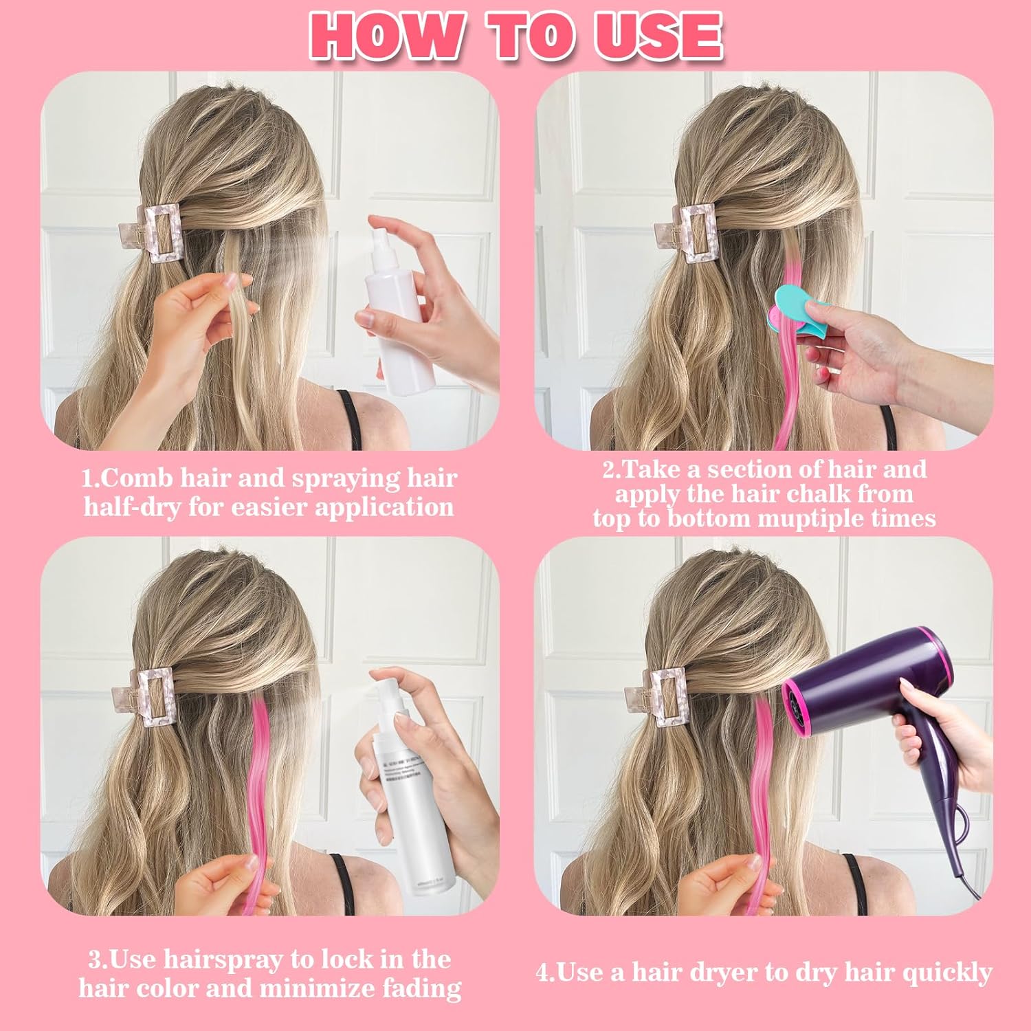 - Easy to use,no professional skills and complicated operation procedures are required,good coverage on hair.Perfect temporary hair dye for any age.Follow this steps:1.Comb hair and spraying hair half-dry for easier application.2.Take a section of hair and apply the hair chalk from top to bottom muptiple times.3.Use hairspray to lock in the hair color and minimize fading.