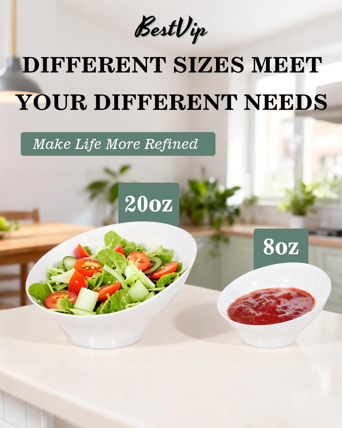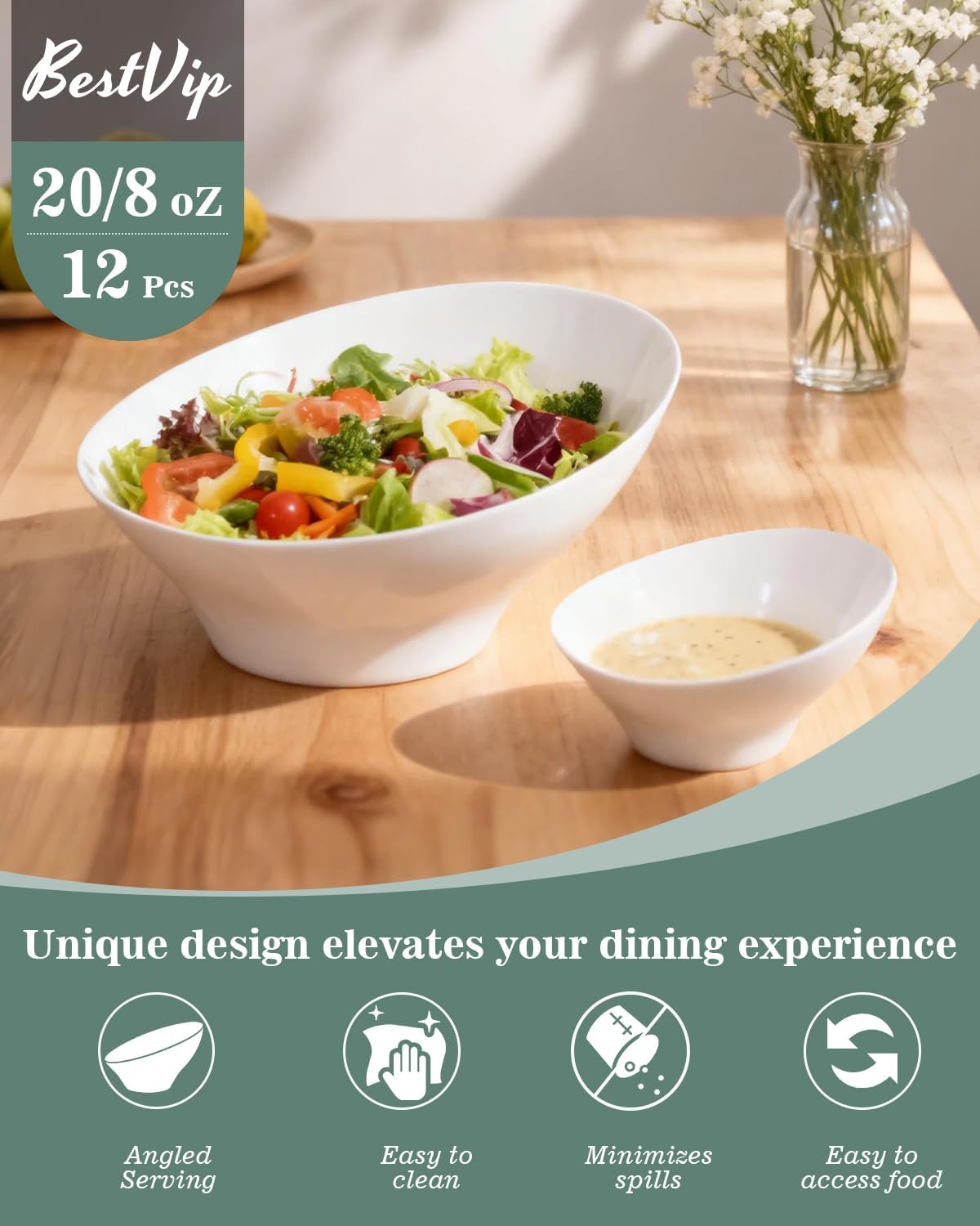 BESTVIP 8oz White Plastic Serving Bowls for Party - 12 Pack Angled Disposable Serving Bowls, Party for Chips, Snacks, Fruit, Salad - Bowls for Parties, Daily Use, Catering, Christmas