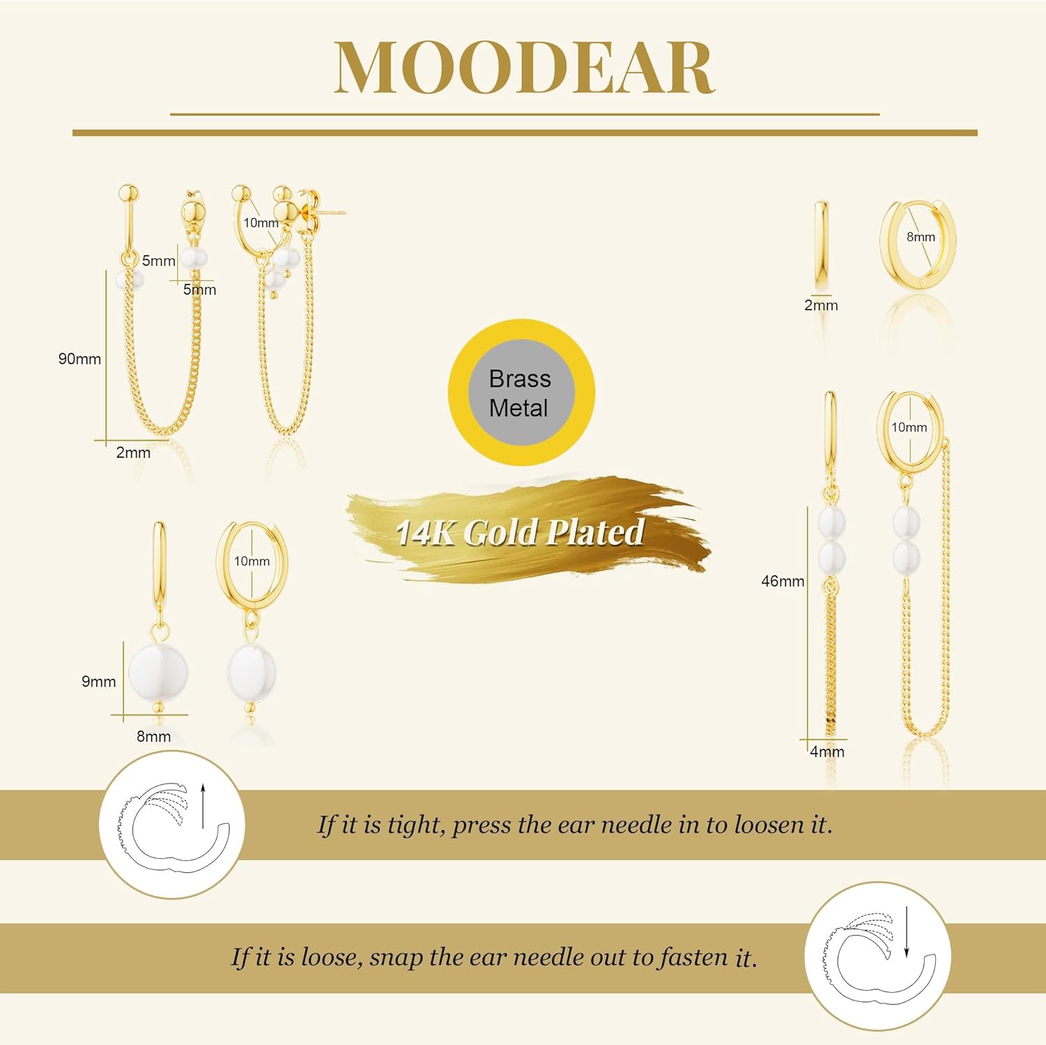 Moodear Gold Earrings for Women No Tarnish - Trendy 14K Gold Plated Pearl Hoop Studs Chain Earrings Stacks for Women Wedding Jewelry Gift