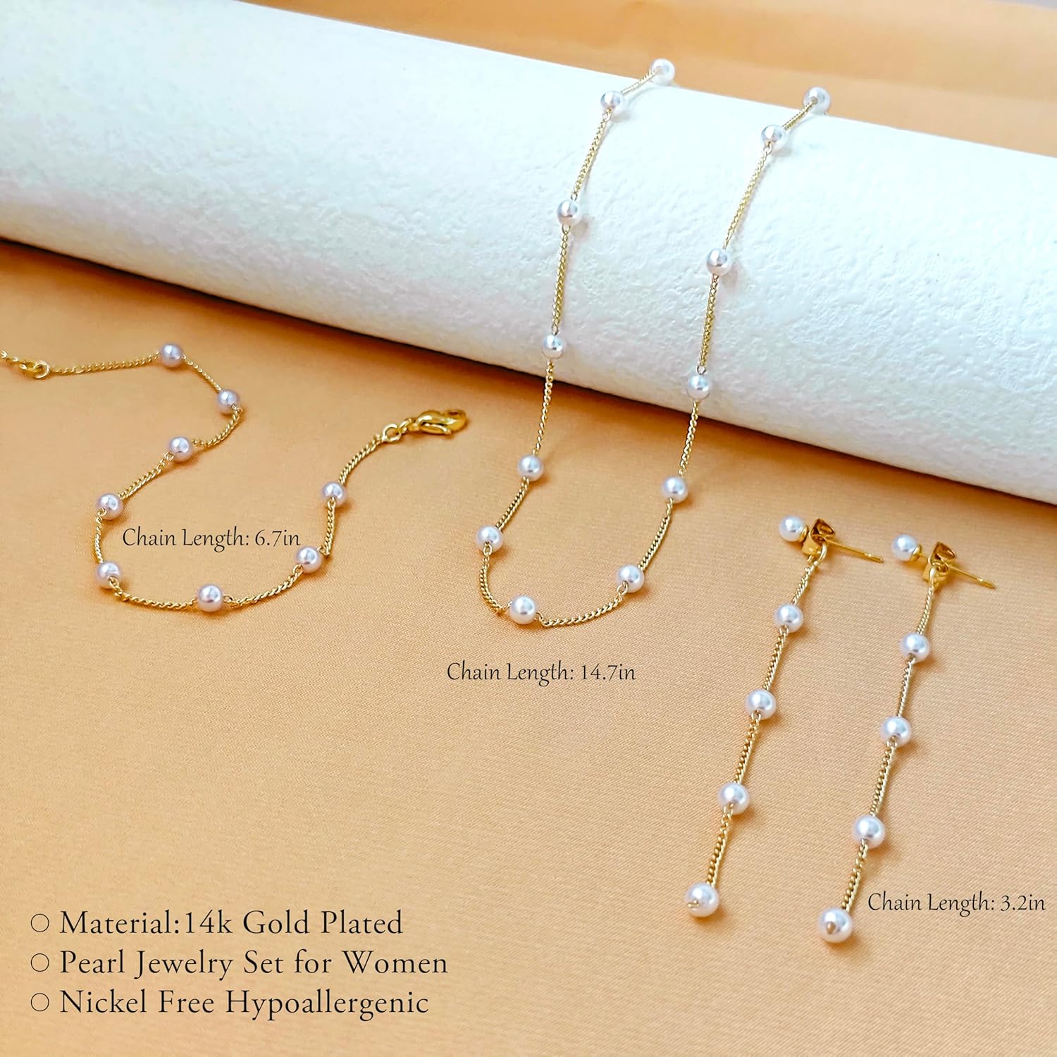 - Women's gold jewelry set: delicate small high luster pearl necklace, bracelet and earrings, can be worn as a set or individually, elegant and versatile, adding fashionable charm to any look.