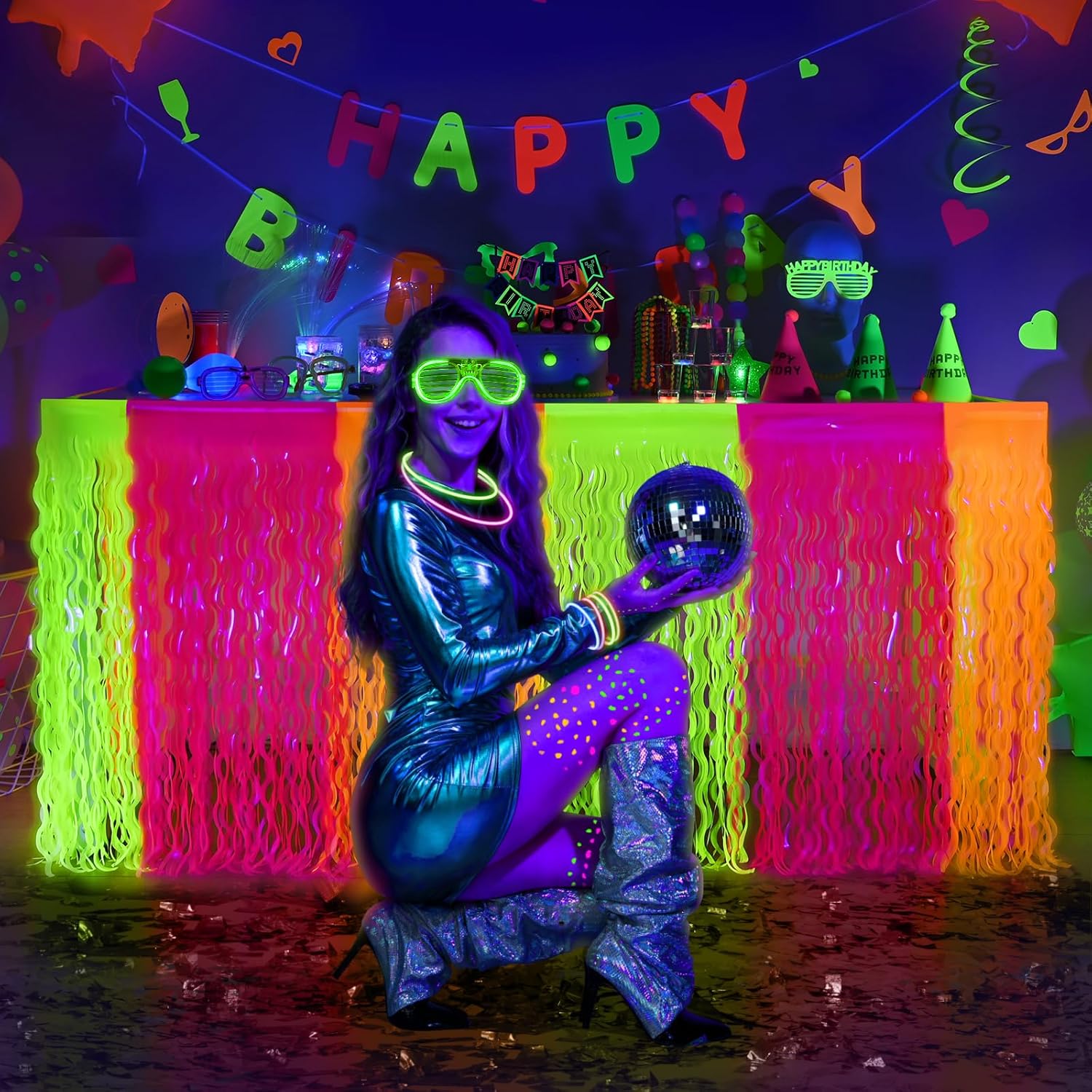 - 【 NEON PARTY DECORATIONS 】: Our unique neon fluorescent tinsel foil fringe table skirts are the perfect photo decorations for neon birthday party dessert table decorations. You will be immersed in the rich colors and glow in the dark party atmosphere they create.