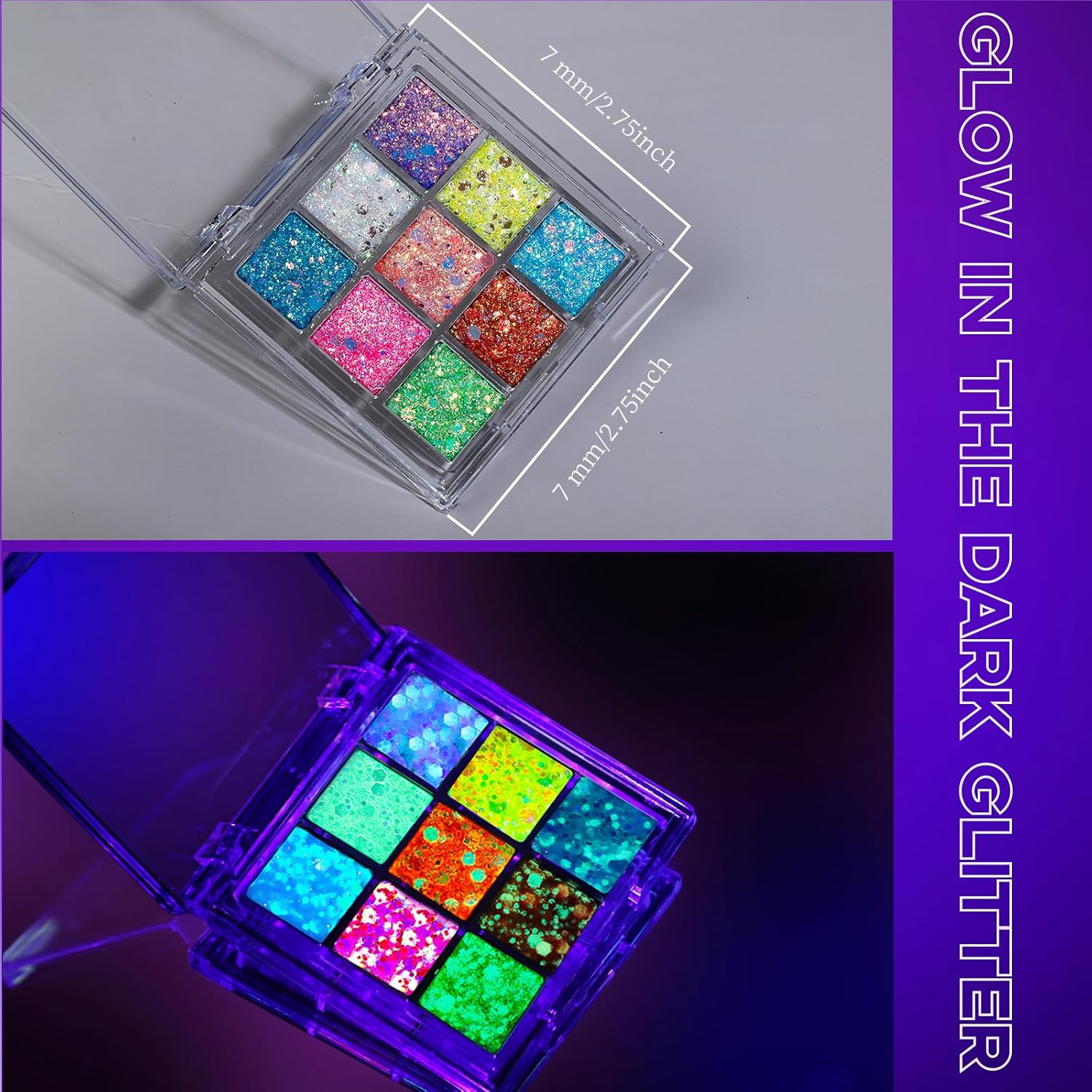 - Glow in The Dark Body Glitter Gel Dazzling in daylight, ultra-bright under UV blacklight, and glowing magically in the dark after charging under light—safe for face, body, and hair, this glow in the dark glitter gel is your ultimate festival, rave, and party essential. Get festival-ready with 9 dazzling shades of UV body glitter! Long-lasting gel formula applies easily and removes