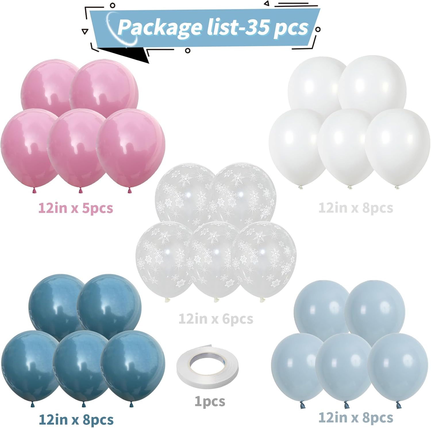 - Blue and Pink Winter Balloons: This 55 pcs 12 inch snowflake balloons kit features 6 pcs clear snowflake balloons, 8 pcs dusty blue balloons, 8 pcs slate blue balloons, 8 pcs matte white balloons, 5 pcs retro pastel hot pink balloons and 1 ribbon