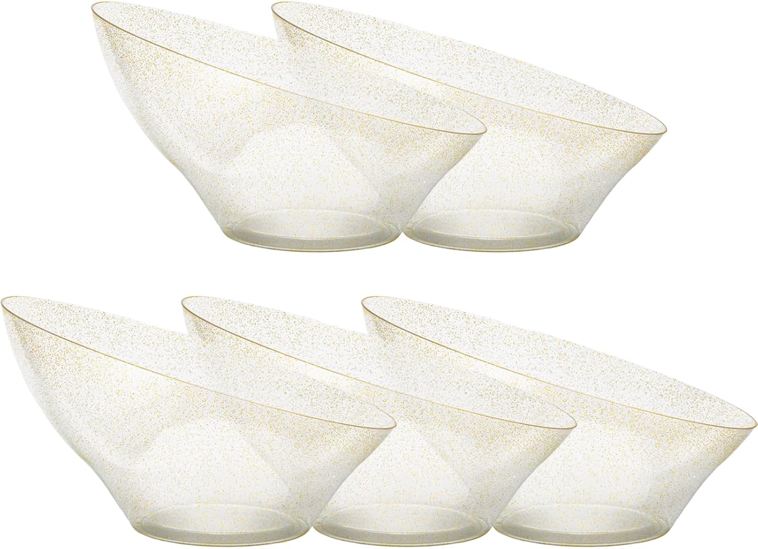 - Perfect Size:These clear gold glitter plastic bowls measure 7.5 inches long, 2 inches high at the front, and 4.5 inches high at the back. Serving bowls for party have a maximum capacity of 20 oz. The size fits daily and party serving needs. Plastic serving bowls easily holds salads, chips, fruits, pasta, tacos, and more. No need to worry about insufficient capacity or wrong size