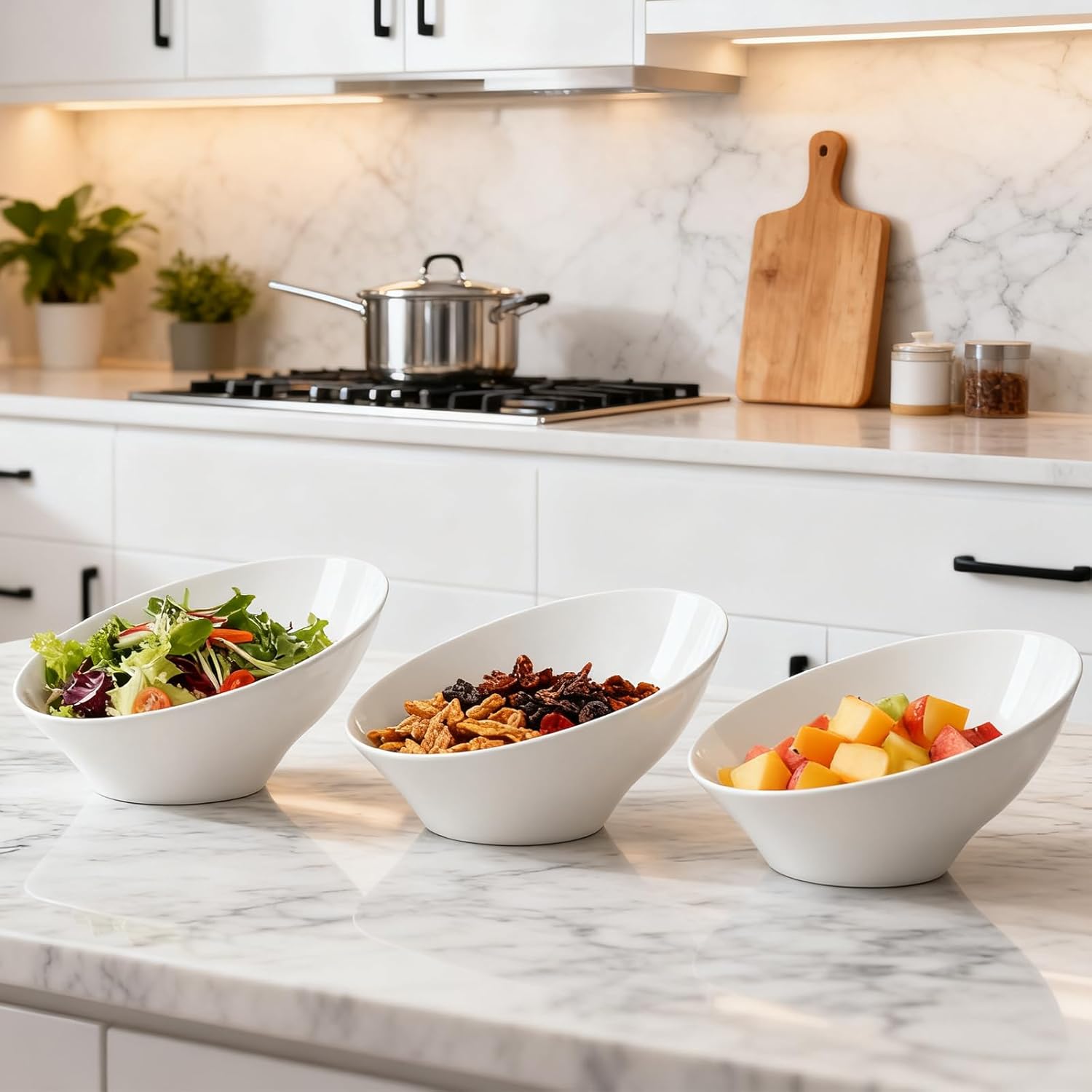 - Versatile for All Occasions:These disposable serving bowls work for daily home meals. Angled plastic bowls also fit Weddings, Halloween, Christmas, Parties, Birthdays, Catering, and more. You can use them as candy bowls, chip bowls, fruit bowls, or salad bowls. They hold both hot and cold foods without losing shape. Entertaining becomes easy and stylish every time