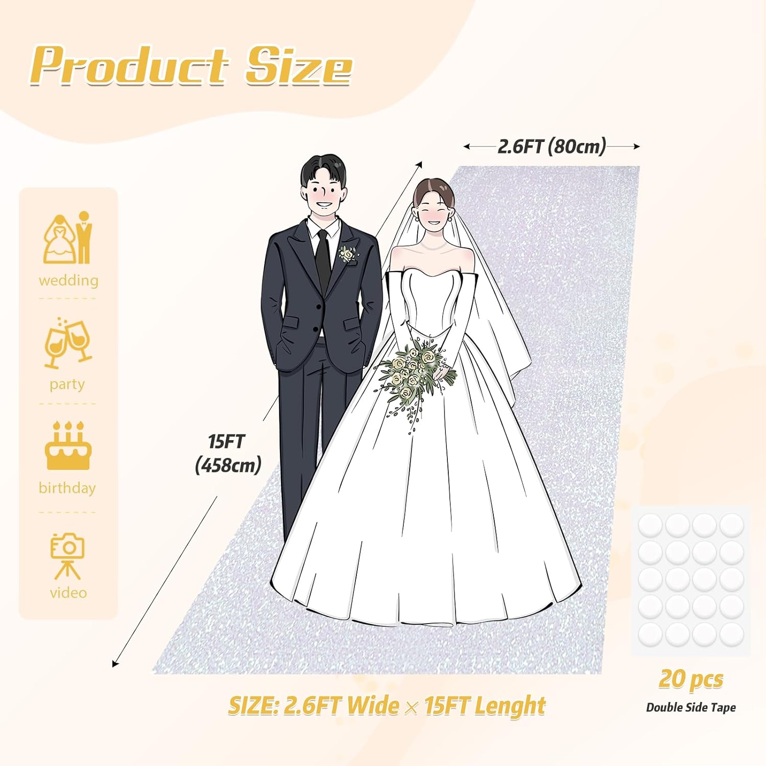 PartyDelight Wedding Aisle Runner Iridescent White 2.6FTx15FT Sequin Carpet Sparkly Rug for Ceremony Indoor Outdoor Engagement Decoration