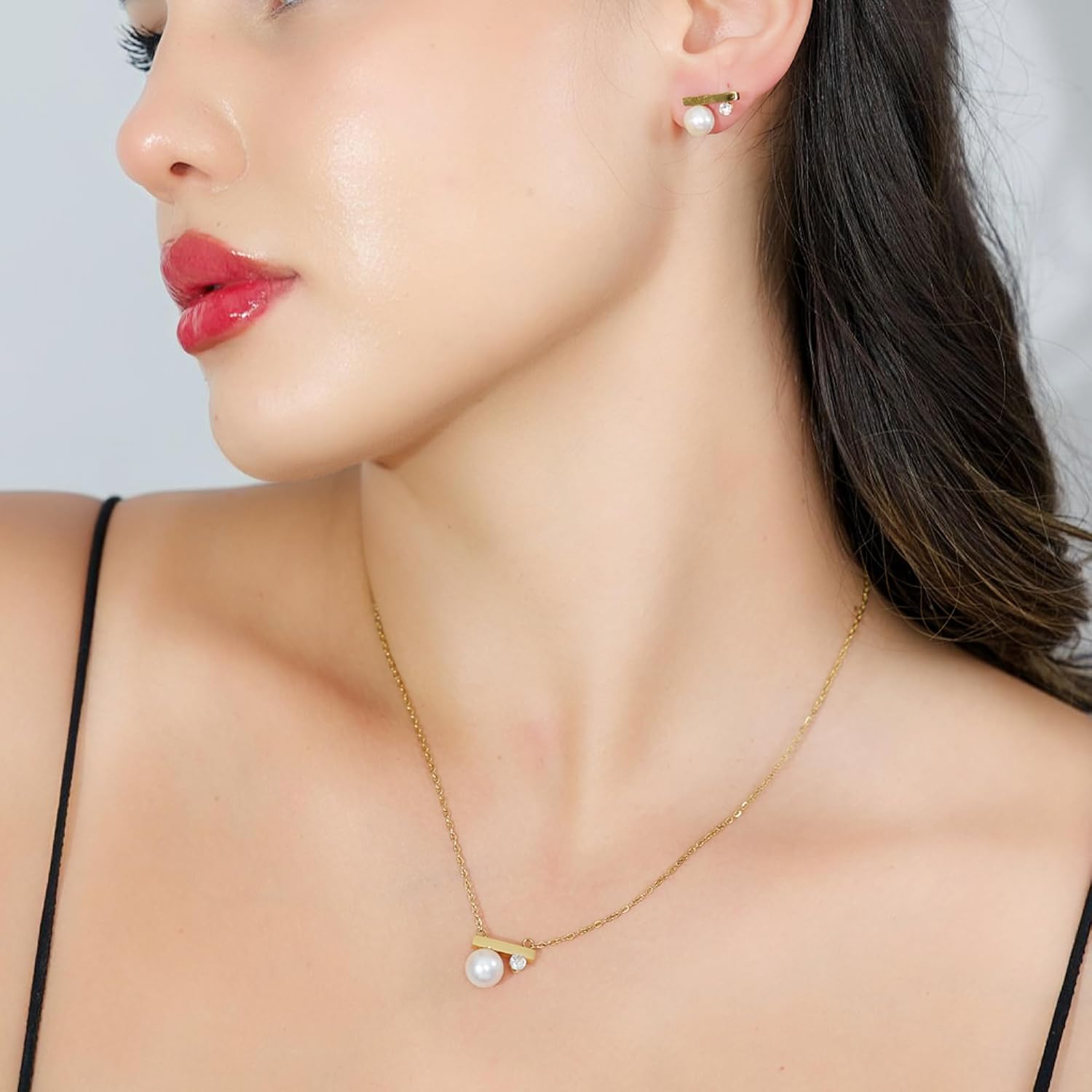 - Designer’s Selection - A stunning freshwater pearl delicately set in a high quality 18K gold plated pendant, paired with matching earring studs. This dainty pearl necklace and earring set for women effortlessly combines sophistication and minimalism, while the sparkling zircon accents and geometric details introduce a playful touch and unique style to your look.