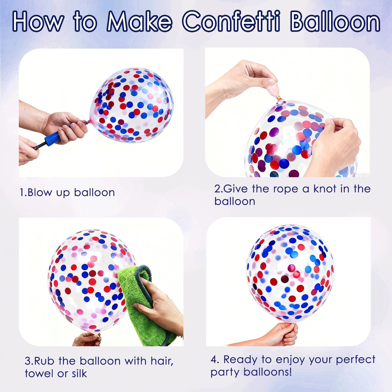 - Easy to assemble: Inflate them with an air pump or helium. If you want them to float, fill them with helium. 12-inch blue and red-blue confetti balloons will meet all your party needs