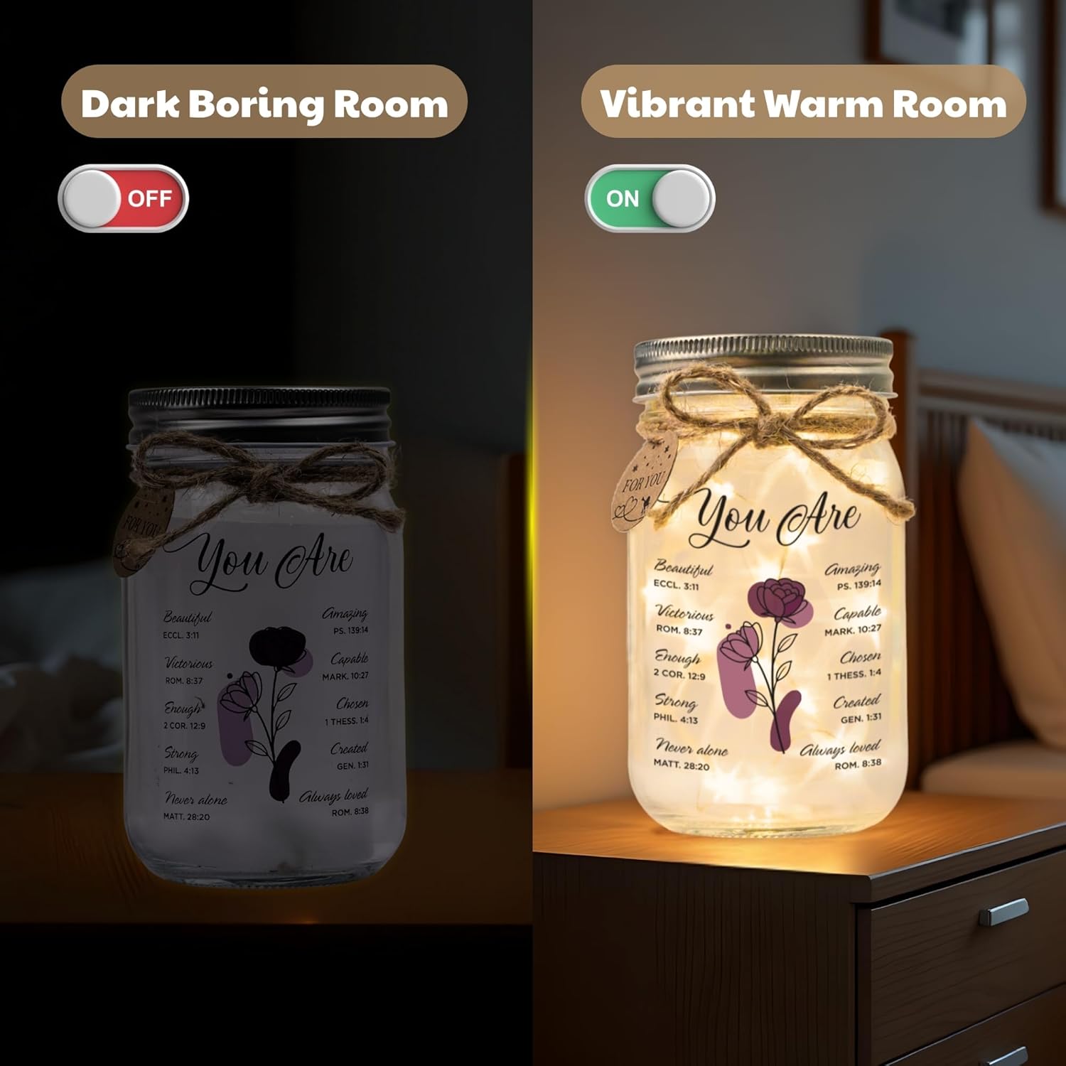 - ๐ DAILY INSPIRATION LIGHT: A glowing mason jar night light that spreads warmth and hope, featuring Bible verse reminders that she is strong, loved, and never alone. A gentle choice among thoughtful birthday gifts for women, friendship gifts, and Christian gifts that bring faith and peace into her everyday moments.
