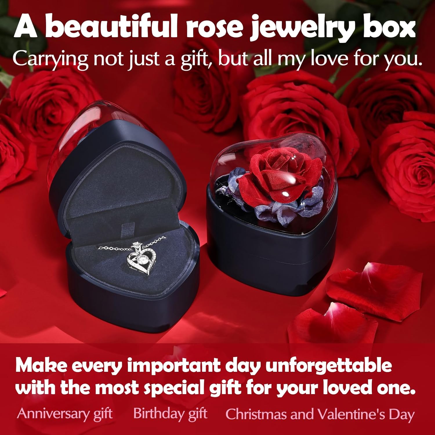 - Comes in an exquisite jewelry box with a red rose and a pop-up greeting card.