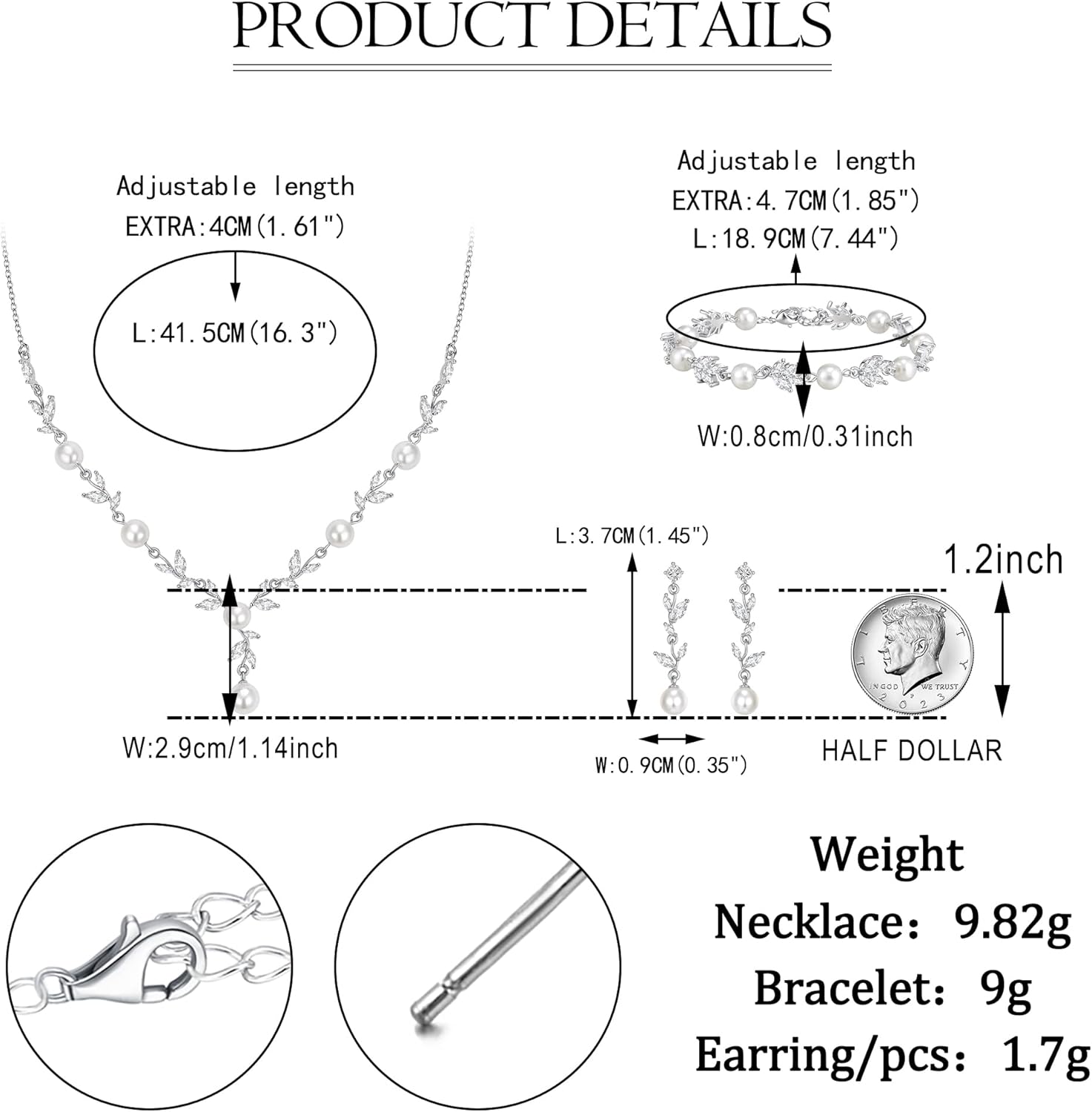 - Elegant Necklace Chain Length: 41.5cm(16.3")-45.5cm(17.91"), Link Chain Bracelet Size: 0.8cm(0.31")by18.9cm(7.44")-23.6cm(9.29"), Earrings Size: 0.9cm(0.35")by3.7cm(1.45"), For Pierced Ears Only.