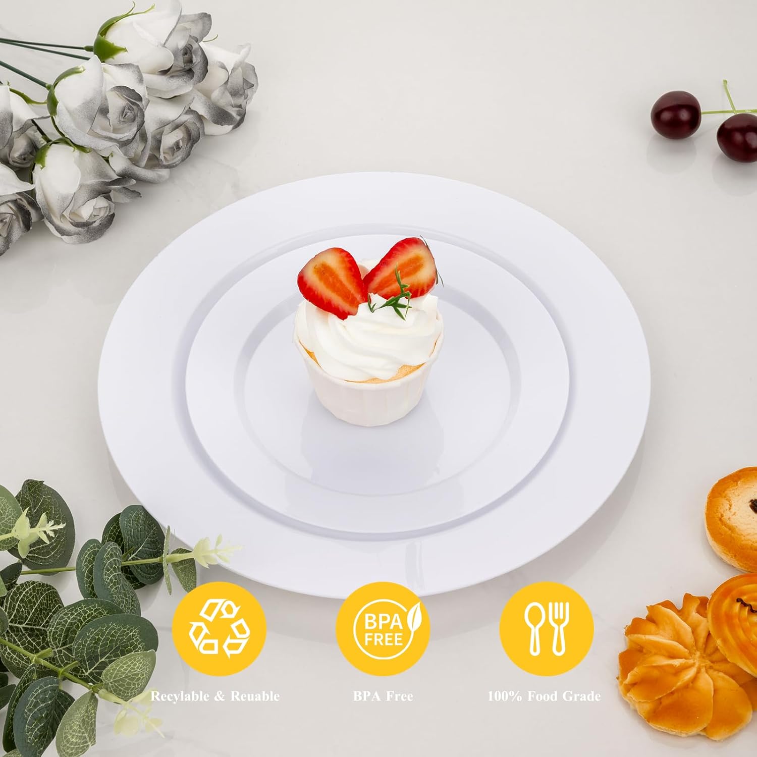 - 100% BPA Free - These disposable party plates are made of food-grade plastic that is BPA-free. If you need to reuse the dishes, simply wash them with water. NOTE: These disposable plastic plates are not recommended for use in the microwave or dishwasher. They are not withstand high temperatures and can be easily damaged if exposed to them.