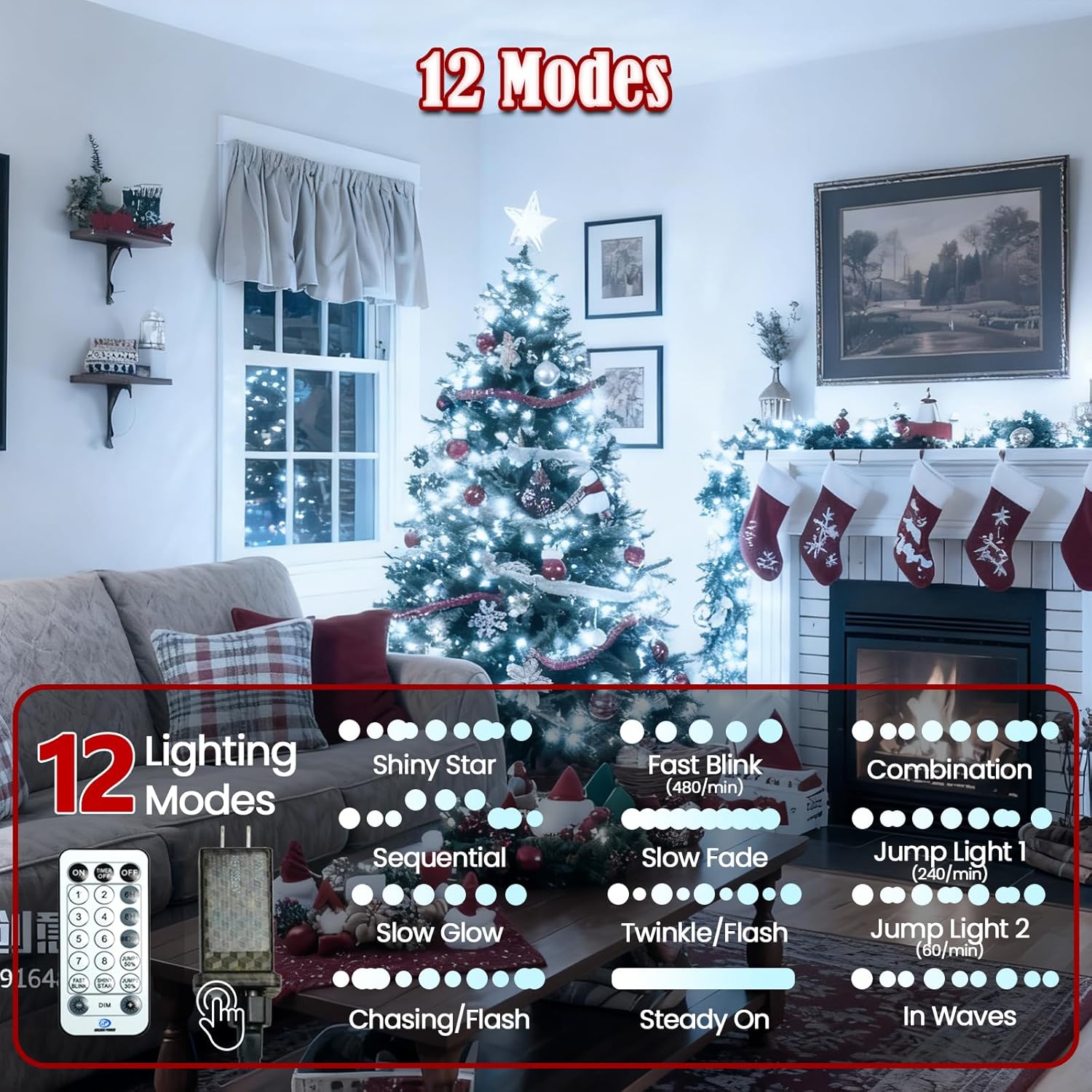 - Wonderful 8 lighting Modes: 8 different modes of outdoor christmas lights to fit every occasion you need. You only need to press the button on the adapter to switch between 8 lighting modes(Combination, In waves, Sequential, Slow glow, Chasing/Flash, Slow fade, Twinkle/Flash, Steady on). And the eight different modes can be applied to different scenes, different moods, different festivals