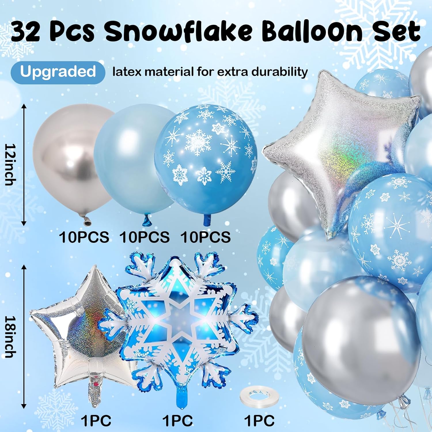 - Blue Winter Balloons: This 32 pcs winter wonderland balloons set includes 10 pcs metallic silver balloons, 10 pcs pearl blue balloons, 10 pcs blue snow flake balloons, 1 pc snowflake foil balloons, 1 pc sliver star foil balloons and 1pcs ribbon