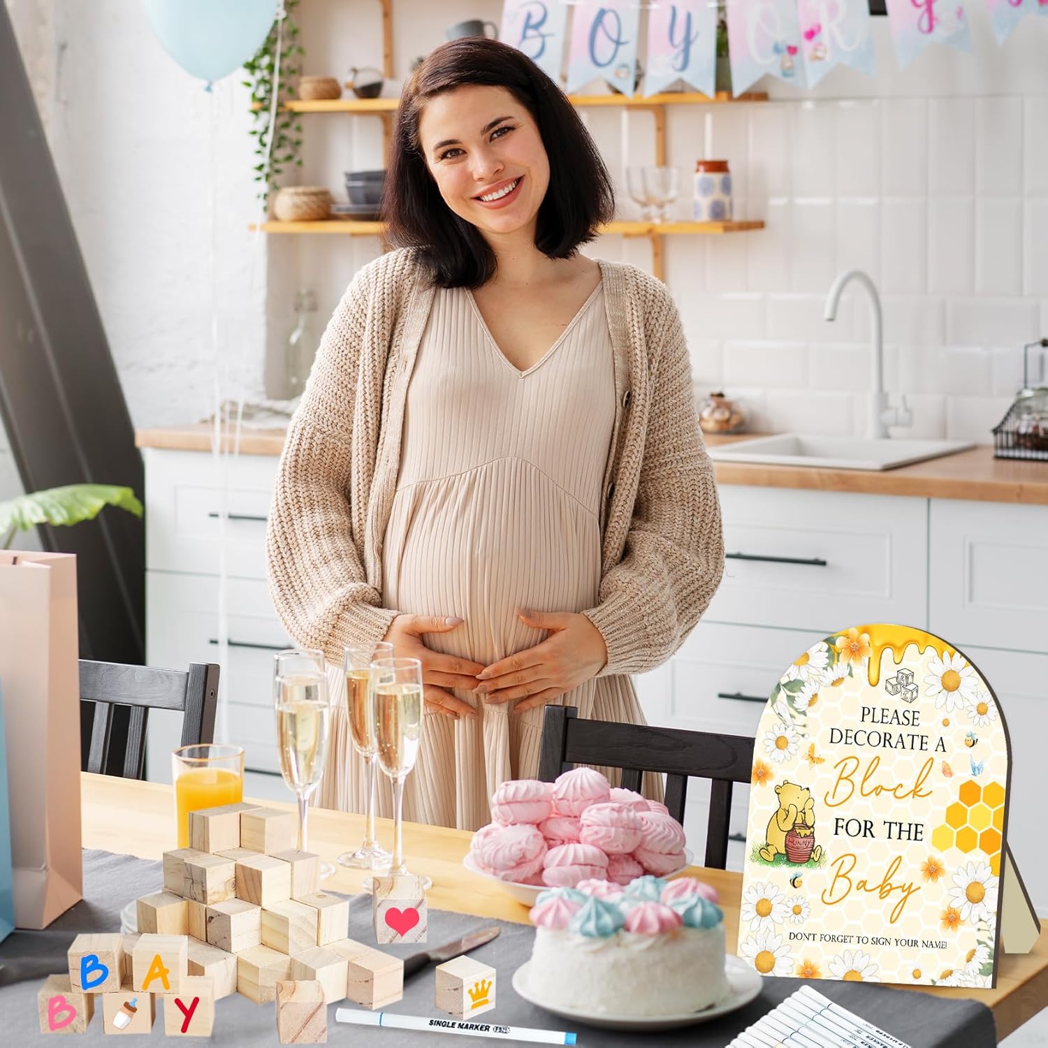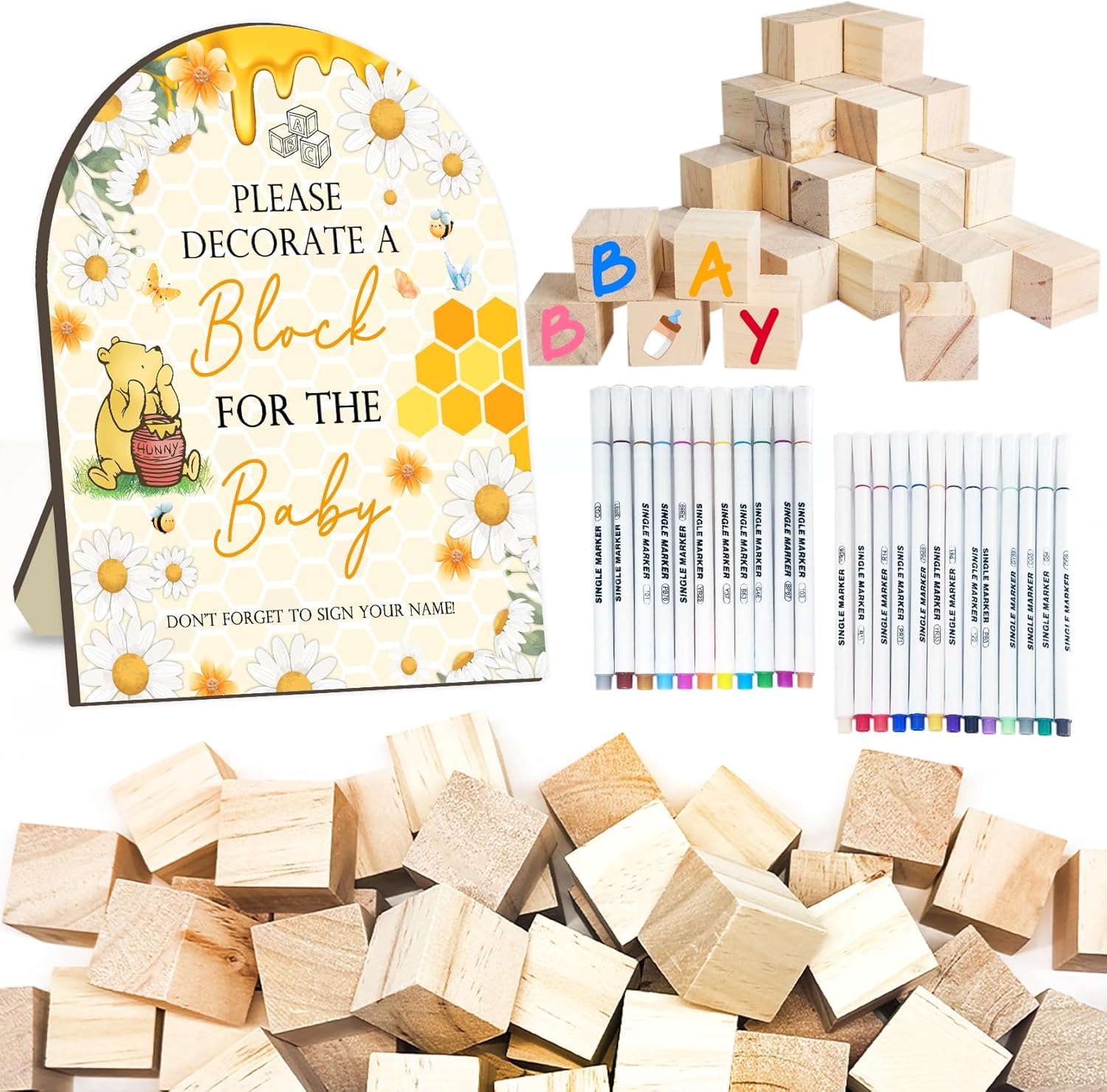- All in One Winnie Baby Shower Game Kit: This complete baby shower activity set includes 1 large Winnie wooden sign, 50 smooth wooden blocks and 24 colorful acrylic paint markers, the perfect setup for a fun and interactive baby shower game that creates lasting memories.