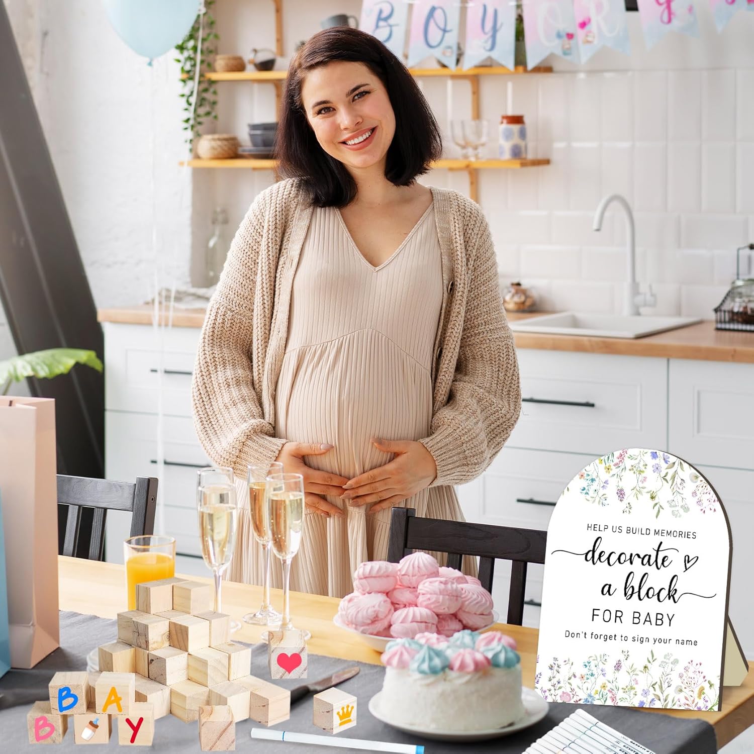 Wildflowers Baby Shower Games Kit, Floral Baby Shower Decor, Floral Baby Shower Games with 50 Blank Wooden Babies Blocks, 24 Acrylic Paint Marker and Wooden Sign, Wildflower Babies Sign for Boys Girls