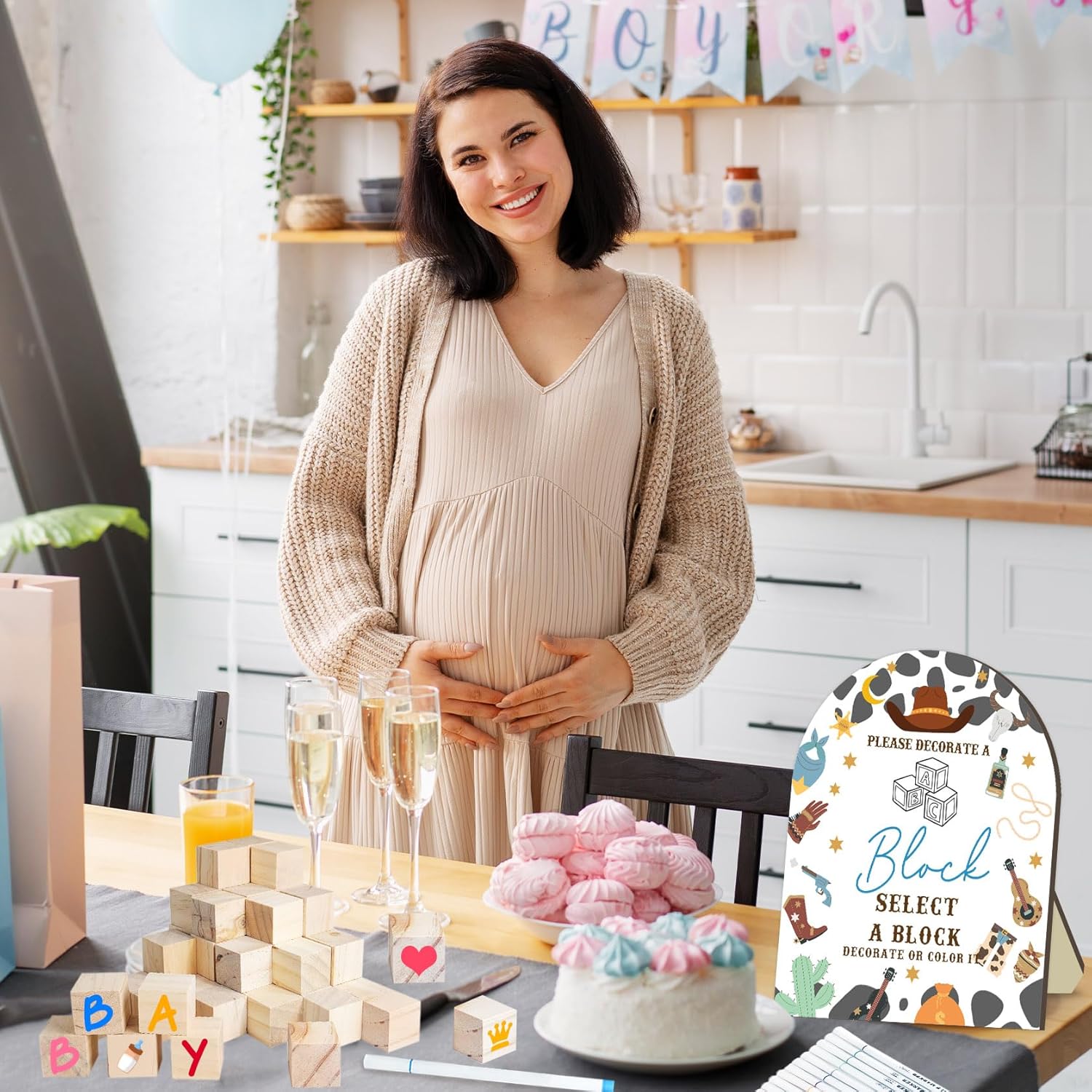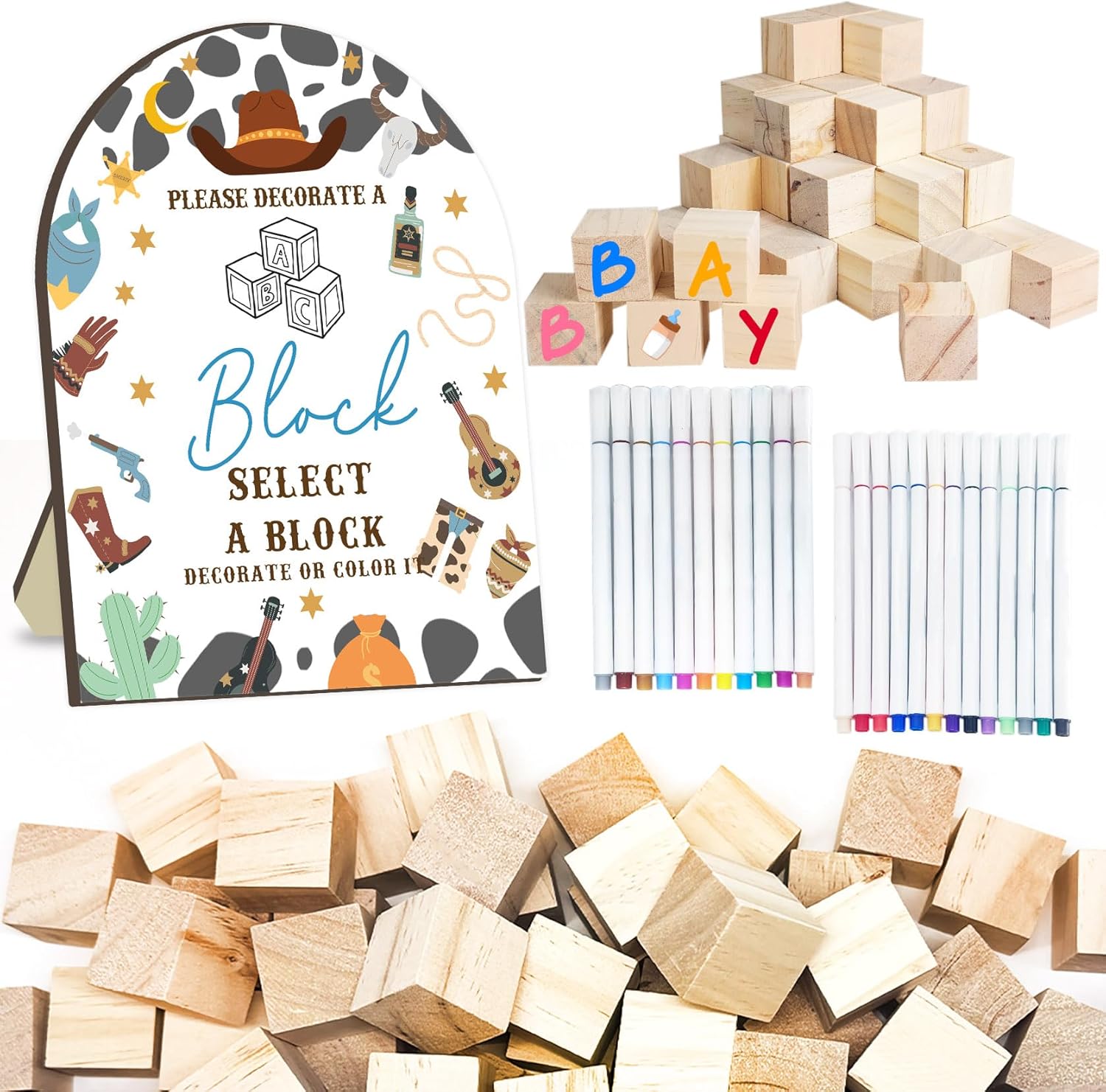 - Western Cowboy Baby Shower Kit: Bring the wild west to your baby shower with this themed game kit, including 50 blank wooden baby blocks, 24 colorful acrylic paint markers, and a rustic style wooden instruction sign. A fun, interactive activity perfect for any western themed celebration.
