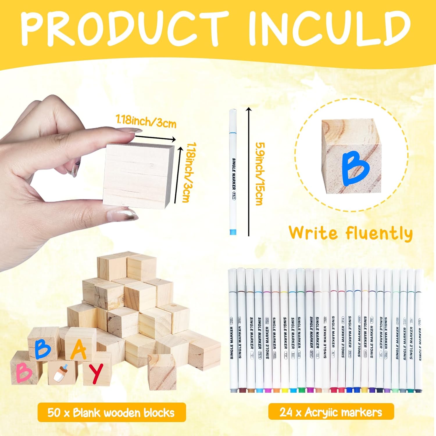 - Included Components : 50 blank wooden baby blocks, 24 acrylic paint markers, 1 wooden instruction sign with a built-in stand 50 blank wooden baby blocks, 24 acrylic paint markers, 1 wooden instruction sign with a built-in stand