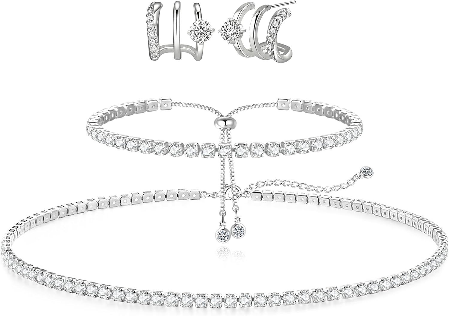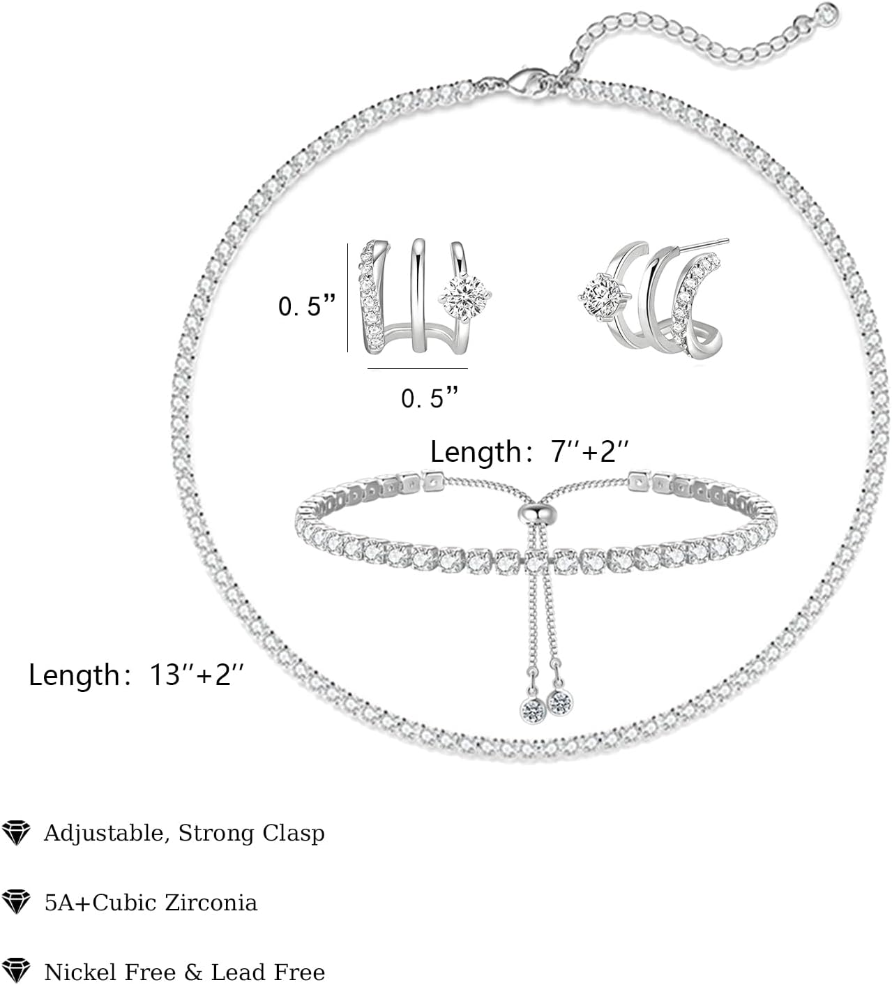 - Jewelry Set - Sterling Silver Rhinestone Tennis Necklace with Adjustable Tennis Bracelet and Triple Hoops Illusion Stud Earrings Earrings CZ Stud Earrings.Will not fray or irritate skin.