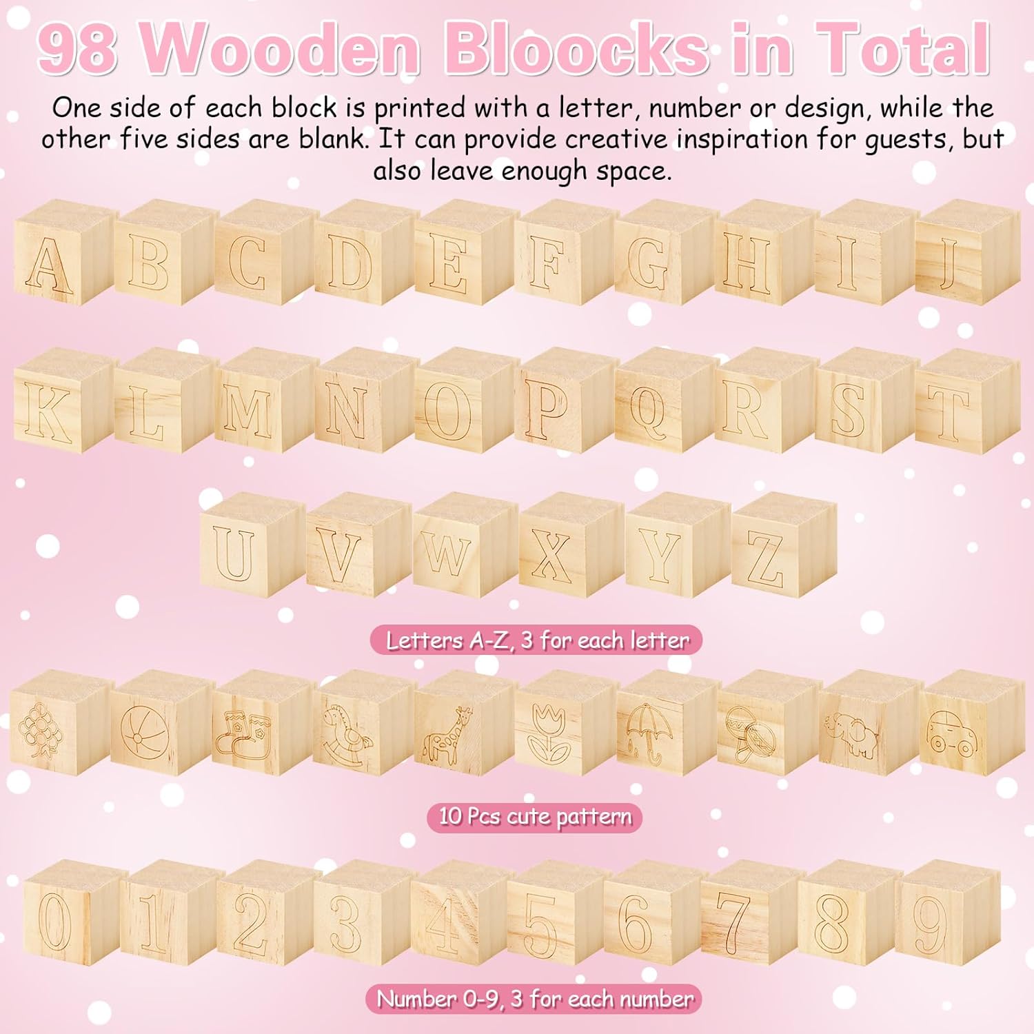 - Funny Baby Shower Games Set: our baby shower blocks kit includes 98 wooden blocks featuring 3 sets of 26 alphabets, numbers 0-9, and 10 patterns; It also comes with 1 game sign, 36-color acrylic markers and a wooden box, Suitable for baby showers and gender reveal parties
