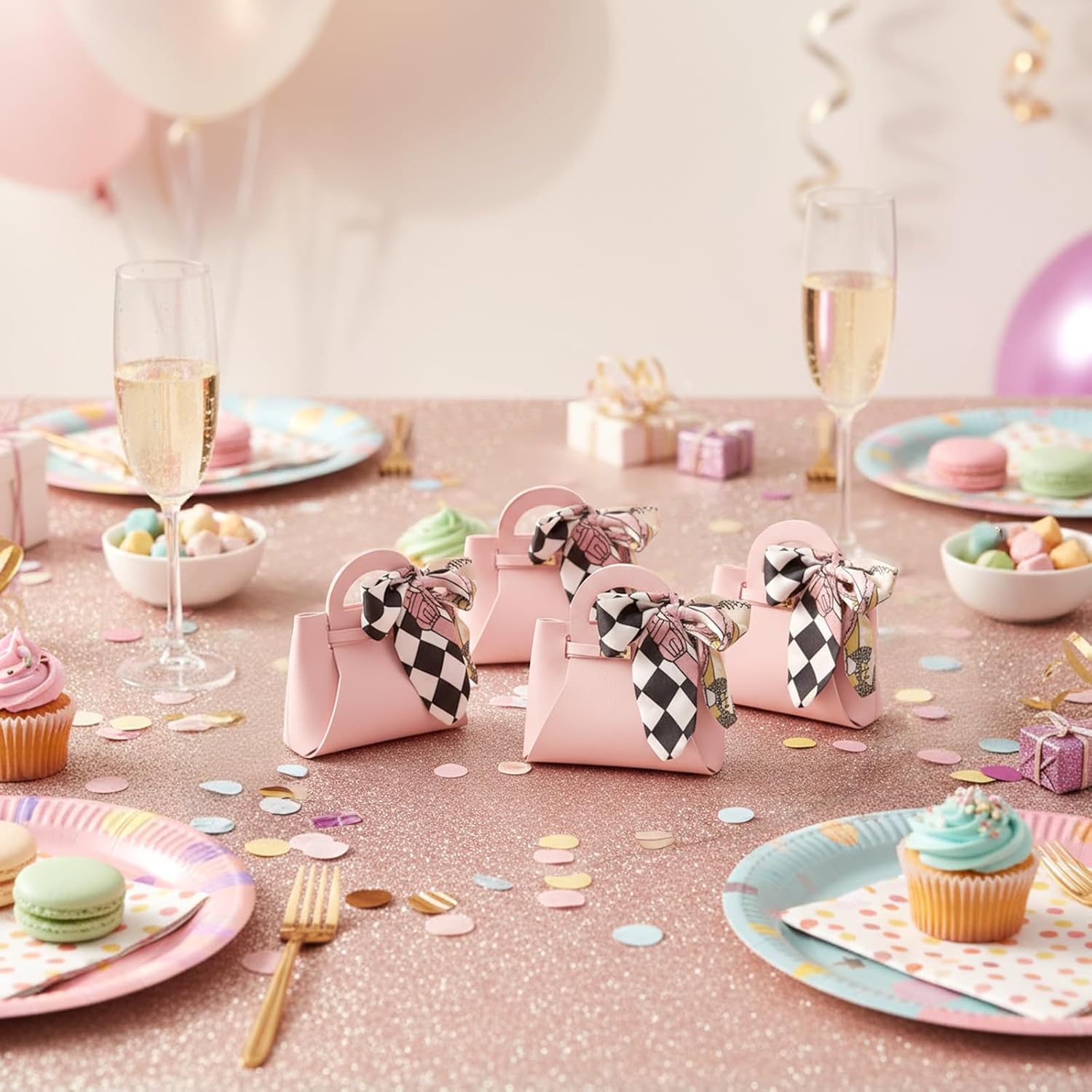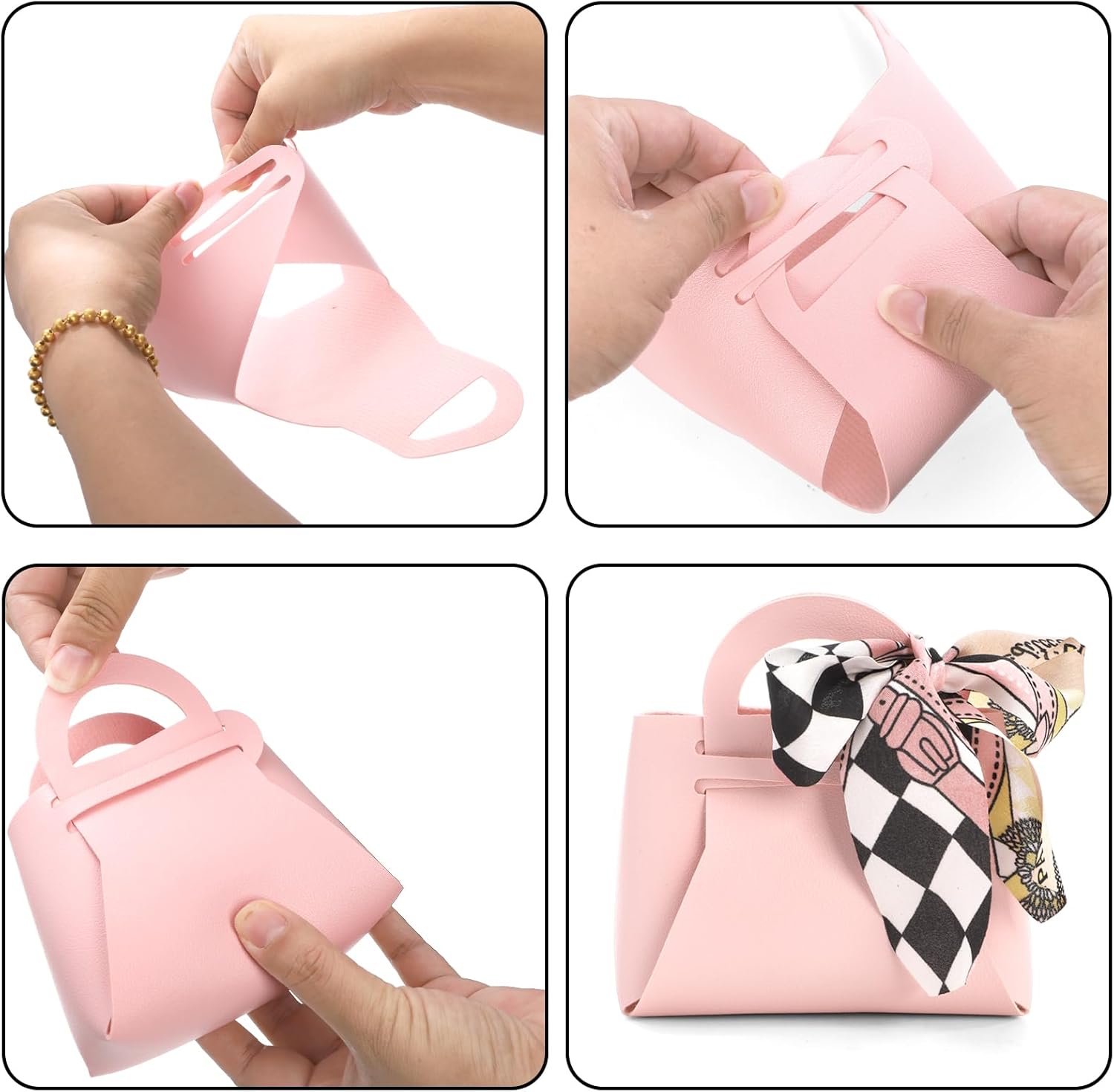 - Easy to Assemble: Package includes 24 pcs elegant pink pu leather handbag style gift bags with handles and decorative ribbons, shipped flat with pre-cut designs, these smal candy gift bags require no tape or glue. Easily assemble in seconds for instant use, perfect for party favors and small gifts.