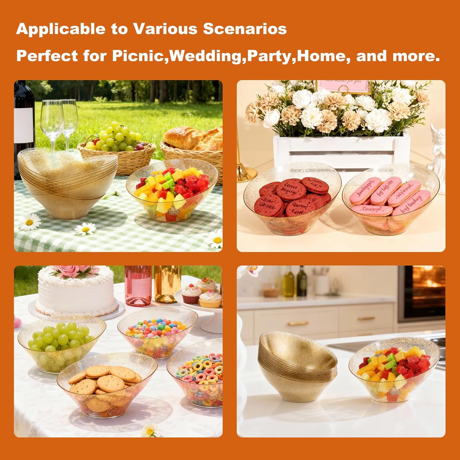 - VERSATILE FOR ALL OCCASIONS & DISHES - Perfect for weddings, holidays, baby showers, or casual gatherings, our elegant party bowls serve as candy bowls, chip bowls, fruit bowls, snack bowls, or even levate holidays as candy dishes for Halloween/Christmas. Designed for both hot and cold foods, they maintain their shape and style whether you're serving pasta or chilled desserts—making entertaining easy, stylish, and stress-free every time