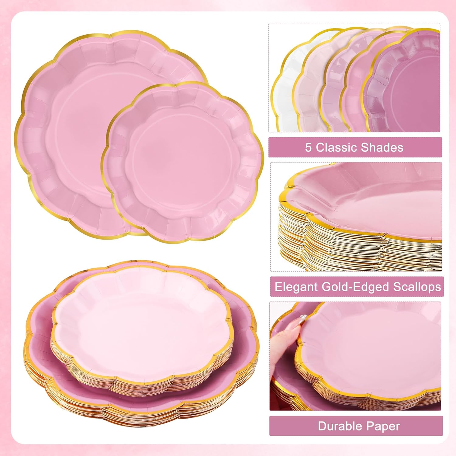 - Elegant Design: The paper plate and napkin set features coordinated dusty pink tones and gold foil scalloped edges, forming an elegant party tableware collection that brings a unique artistic touch to your dinner party, wedding, or celebration