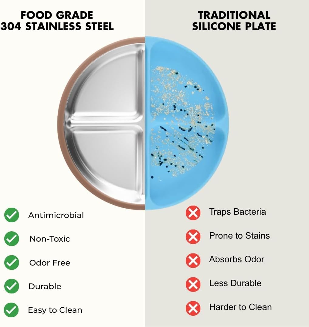 - HASSLE-FREE CLEANING & EVERYDAY CONVENIENCE – Resistant to common food stains like carrots, beets, or pasta sauce, the smooth stainless steel surface is easy to clean and stays looking new. Both the plates and silicone suction sleeves are dishwasher-safe and separate easily for quick, thorough cleaning—saving busy parents time every day