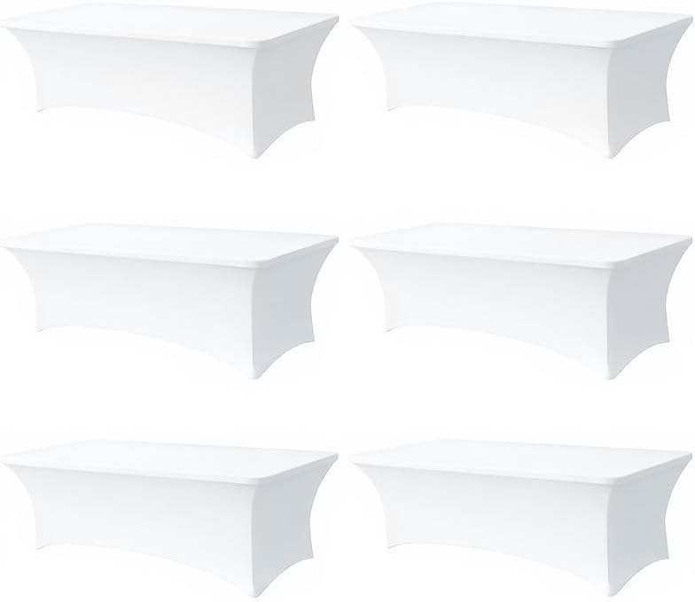6 Pack 8FT Rectangular Spandex Tablecloth,Wrinkle Resistant Fitted Cover for 96x30 inch Banquet Table Cloth, Washable Stretch Fabric for Party, Events, Wedding, Vendor - White