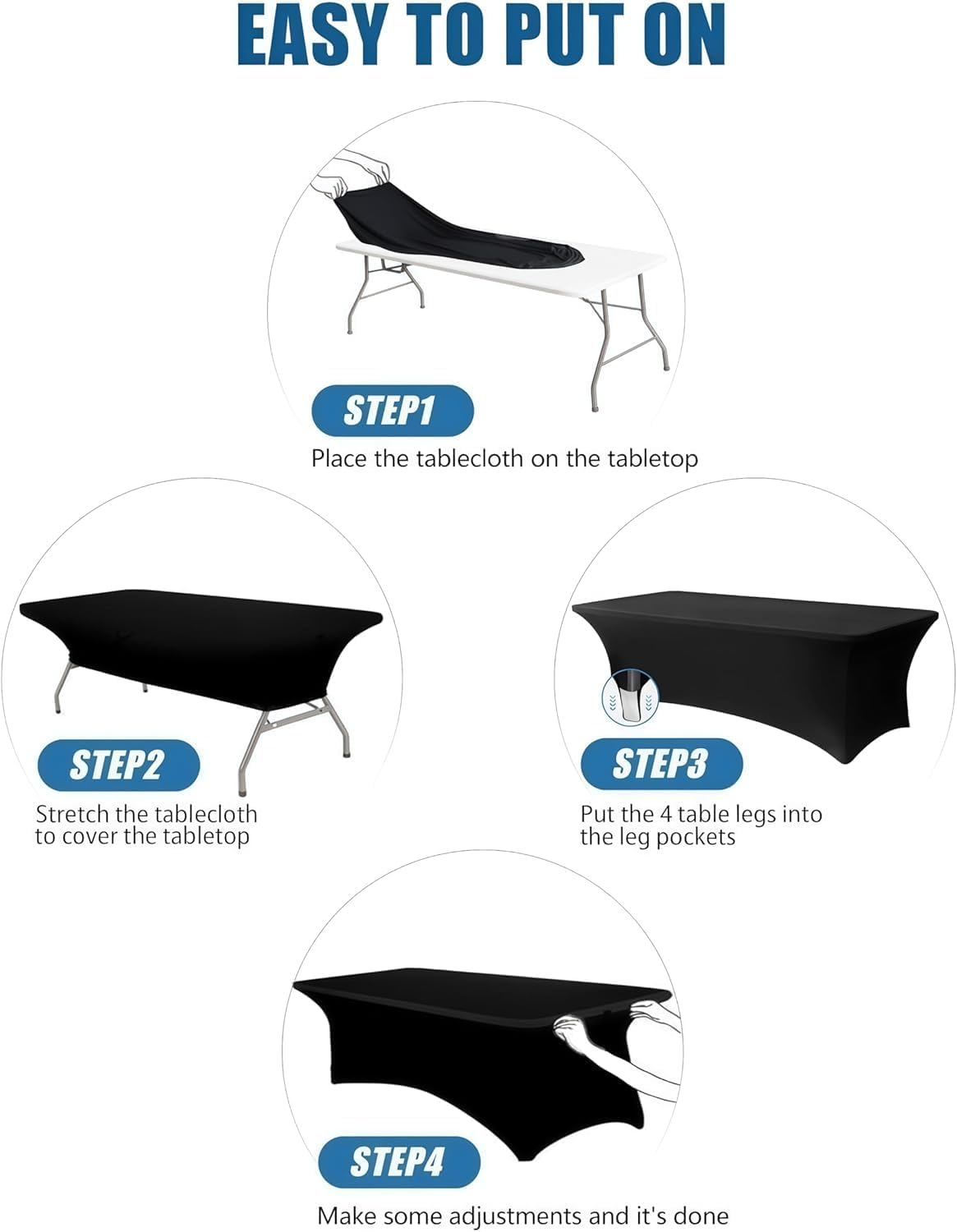 - Secure Fit with Reinforced 4 Leg Pockets: Get a consistently taut and sleek look. Each corner features a deeply stitched, reinforced pocket for the table legs. This smart design ensures the table cover stays securely in place through any event, from busy trade shows to lively banquets.