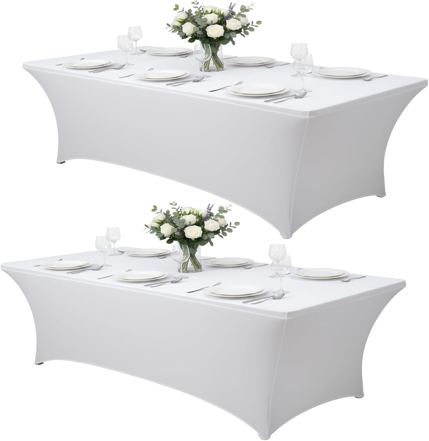 2 Pack 8FT Rectangular Spandex Tablecloth,Wrinkle Resistant Fitted Cover for 96x30 inch Banquet Table Cloth, Washable Stretch Fabric for Party, Events, Wedding, Vendor - White
