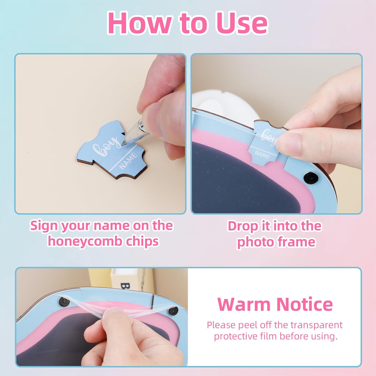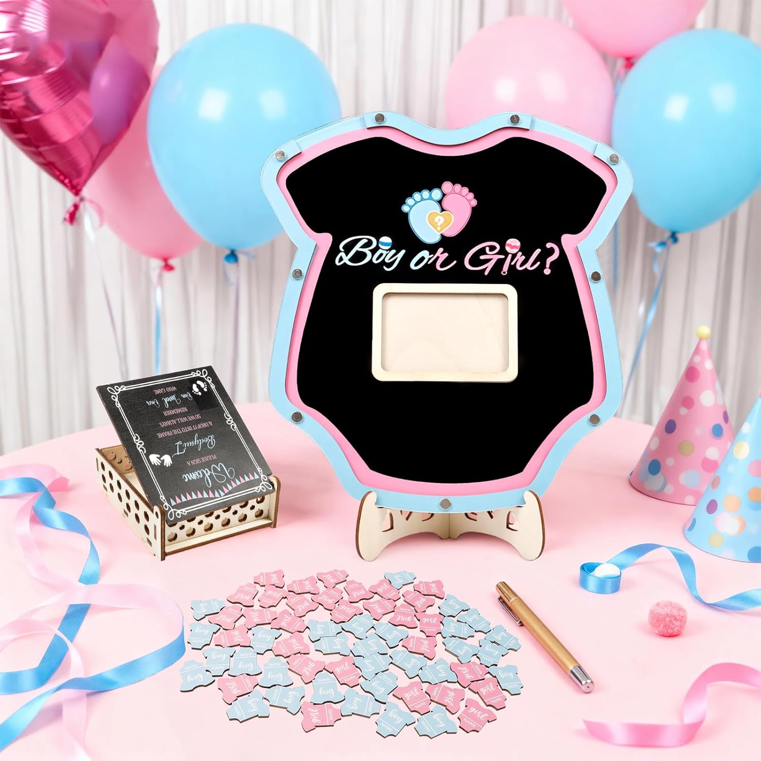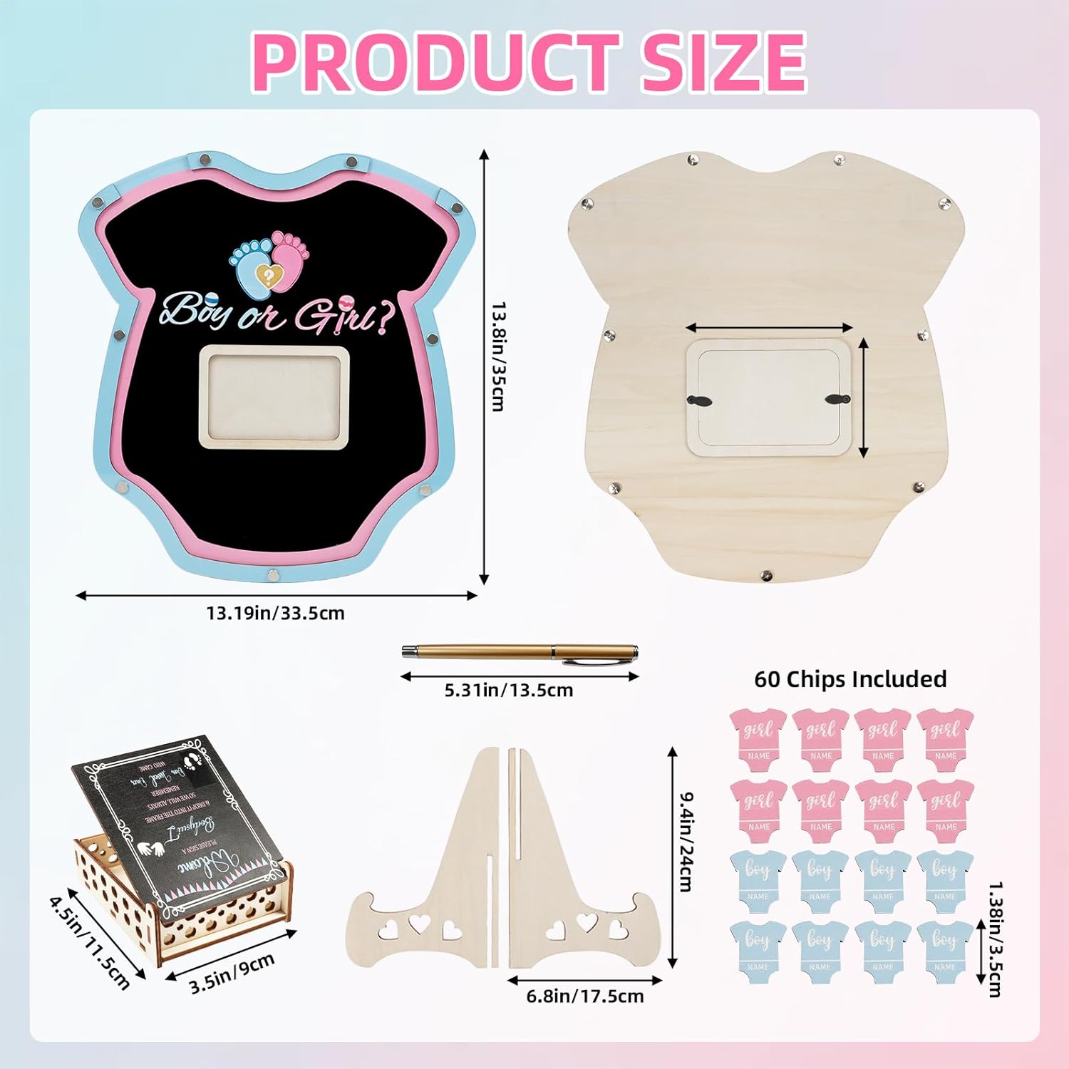 - Gender Reveal Guest Book Set: This all-in-one gender reveal baby shower set offers a unique way to capture precious memories. The package includes 1 beautifully designed wooden picture frame with stand, 1 matching wooden memory box, 60 customizable wish cards (30 pink + 30 blue), and 1 premium golden pen with black ink