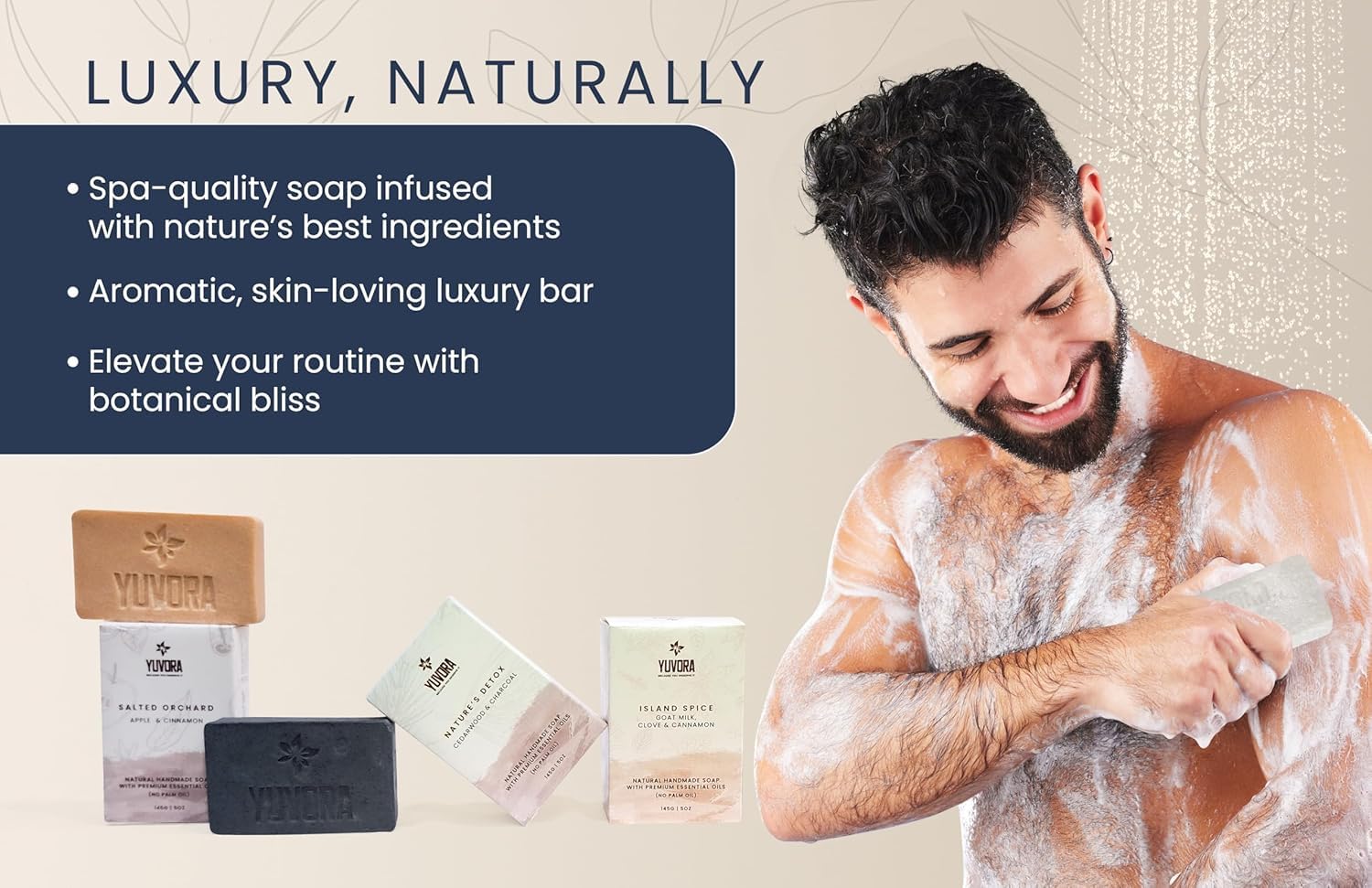 - 4 Unique Masculine Fragrances – Featuring bold and refreshing scents like Goat Milk, Clove & Cinnamon, Basil Salt & Peanut, Cedarwood & Charcoal offering a rugged yet soothing aroma for an energizing shower experience.