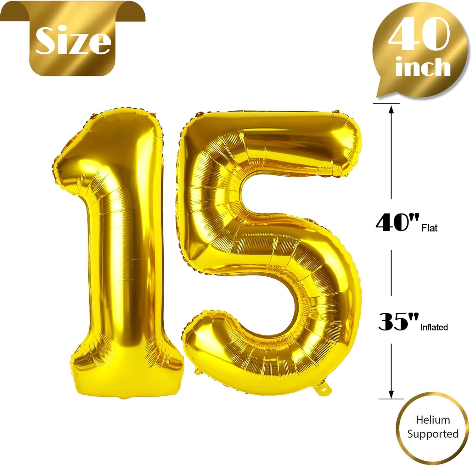 Gold Number 15 Balloon 40 Inch, 15th Birthday Party Decorations for Children, Giant 15 Foil Balloon for Party Supplies